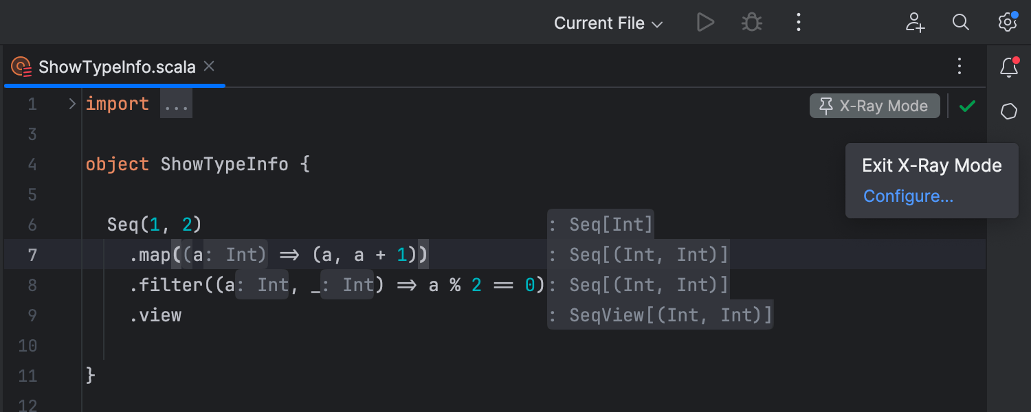 我们引入了新图标:一个新图标适用于 New Project(新建项目)向导中的 Scala 语言,另一个适用于 View | Tool windows(视图 | 工具窗口)中的 SBT。 此外,您还会注意到嵌入提示的呈现方式得到微妙增强,包括圆角和改进的对齐。 此外,我们还在 Settings | Editor | CodeStyle(设置 | 编辑器 | 代码样式)帮助页面中添加了 Scala 文档。 在工作表中,使用 Scala 2.13.12 时,编译错误会在构建窗口中再次正确报告,并且在第一次代码编译之前 import 不会再被错误地标记为未使用。 此外,您现在可以固定 X-Ray 功能,确保即使在释放 Ctrl 键后其仍保持活动状态。
