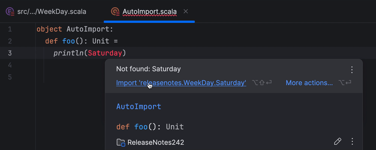 我们增强了基于编译器的错误高亮显示的性能。 文件被修改后,不会再提供过时的错误高亮显示信息。 此外,IntelliJ IDEA 现在支持 Scala 编译器诊断,使其可以作为常规快速修复,以便于应用。