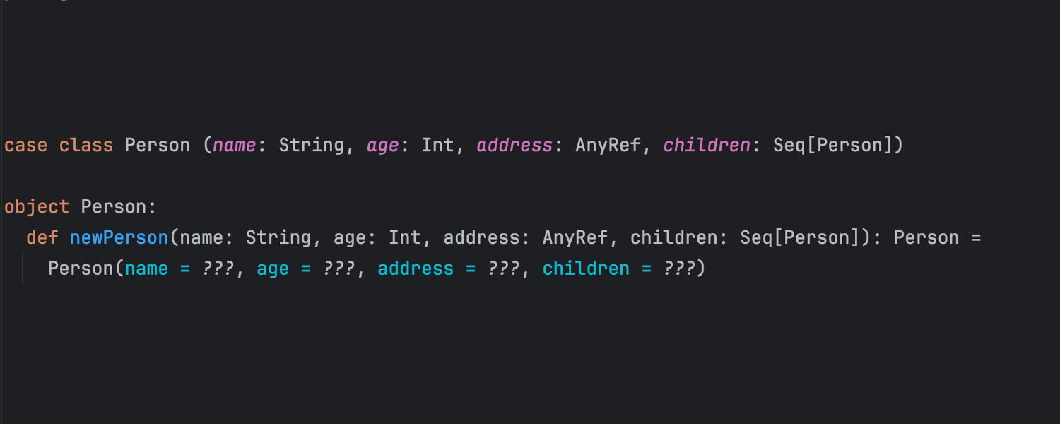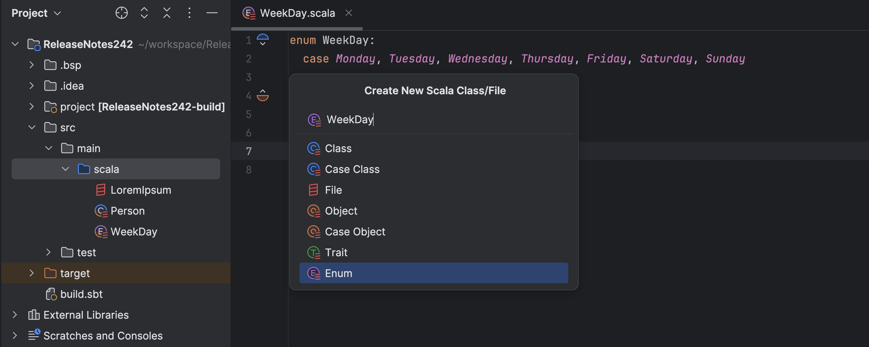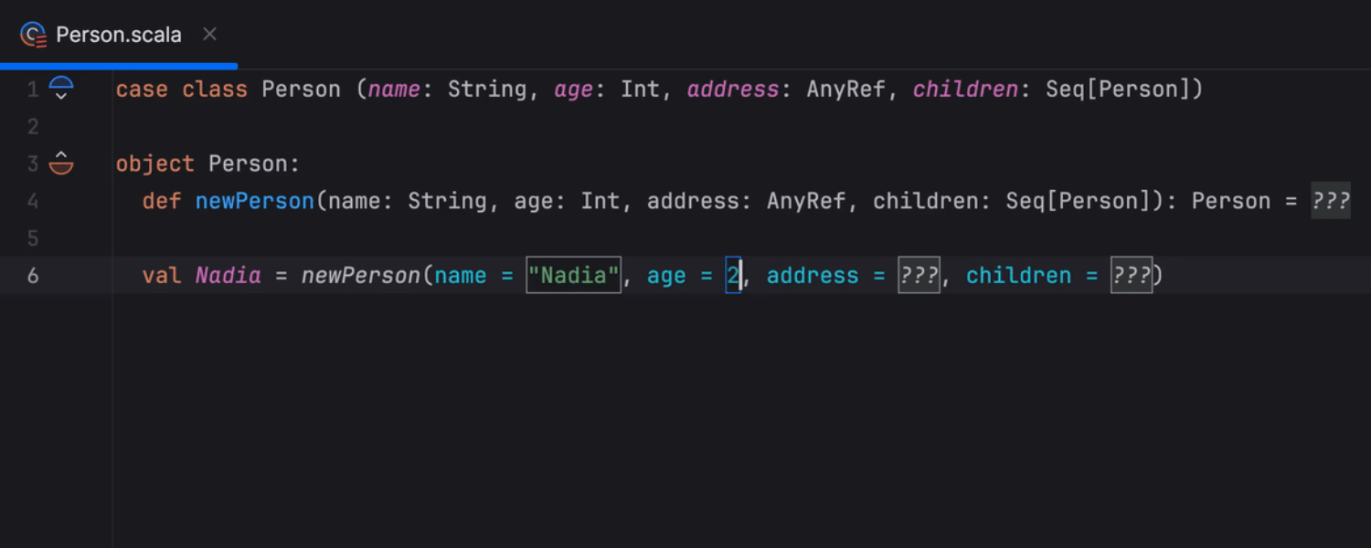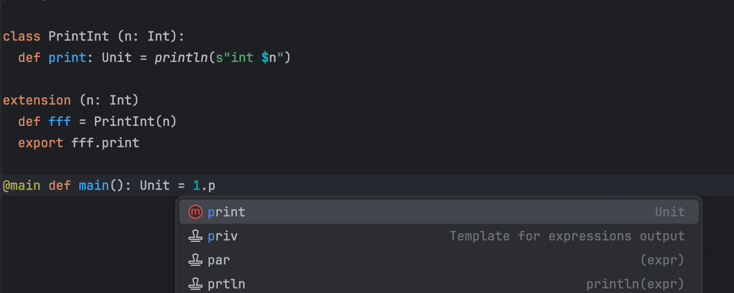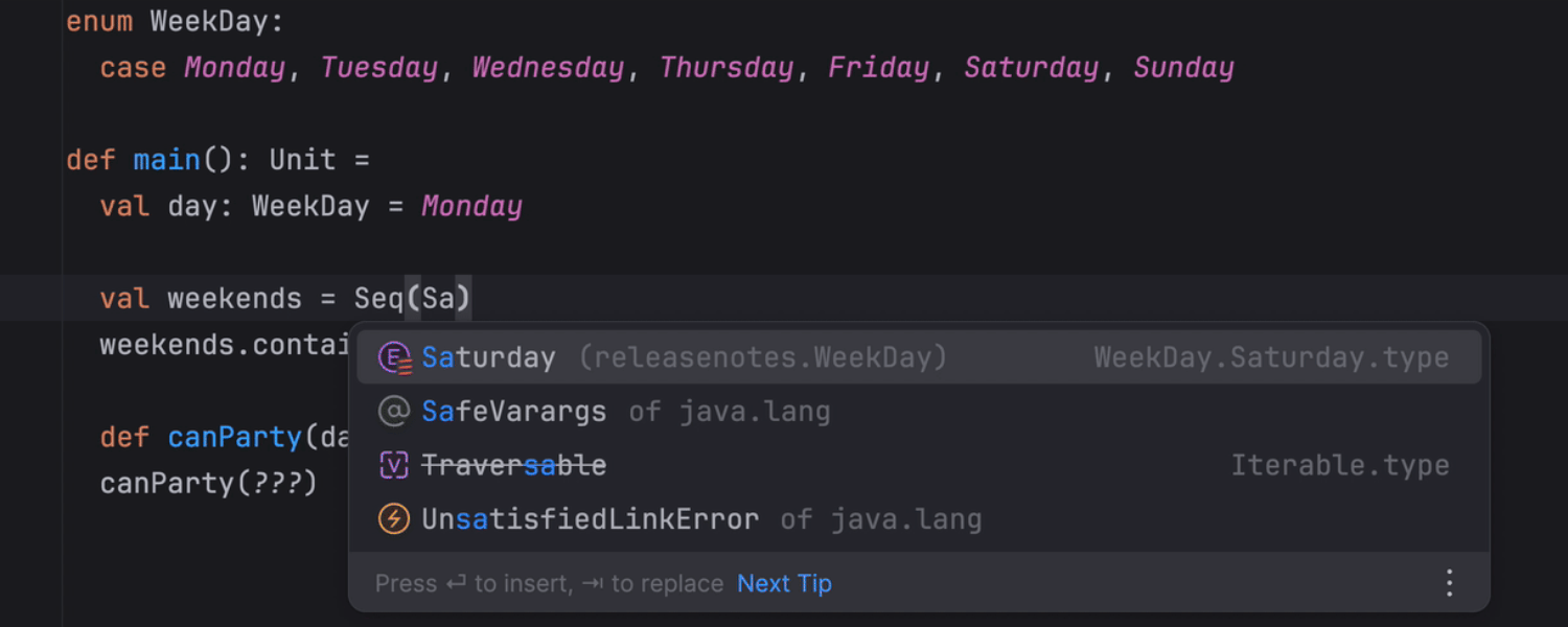 在 Scala 3 中,IDE 现在可以自动填写方法的所有命名实参并自动补全联合体类型的字面量值。 现在,只要需要枚举类型,枚举 case 就会出现在建议中。 此功能适用于 Scala 3 枚举和联合体类型、Scala 2 ADT 和枚举以及 Java 枚举,提供更有意义的建议来简化您的编码体验。