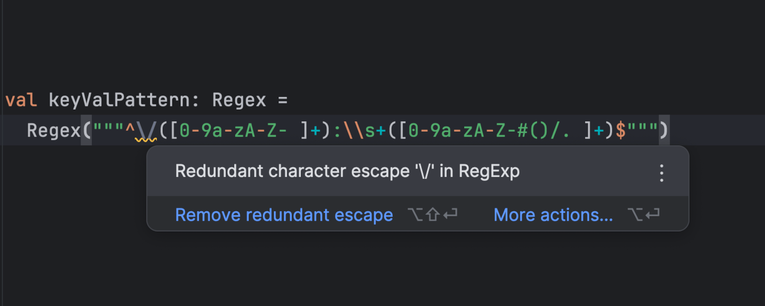 IntelliJ IDEA 2024.2 对错误和语法高亮显示引入了多项改进。 现在,它将形参子句中定义的类字段高亮显示为字段而不是形参。 命名实参现在以不同的颜色高亮显示,在代码中更易识别。 Regex("...") 中正则表达式语法的高亮显示与 "...".r 中正则表达式语法的相同。 我们修正了重构后或无法解析符号类型导致有效代码以红色高亮显示的问题。 在许多情况下,语义高亮显示将在您输入时应用。 此外,修正错误时,IDE 现在响应更快,修正后会立即移除红色代码。