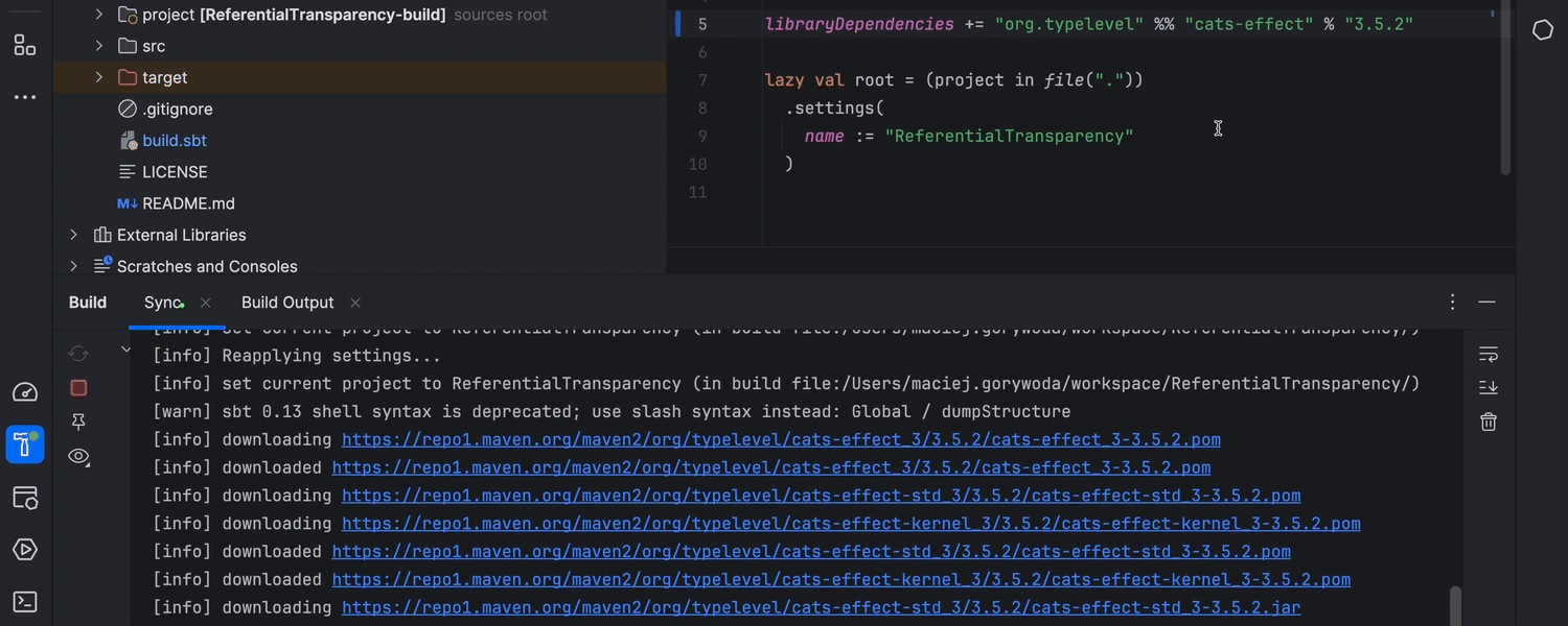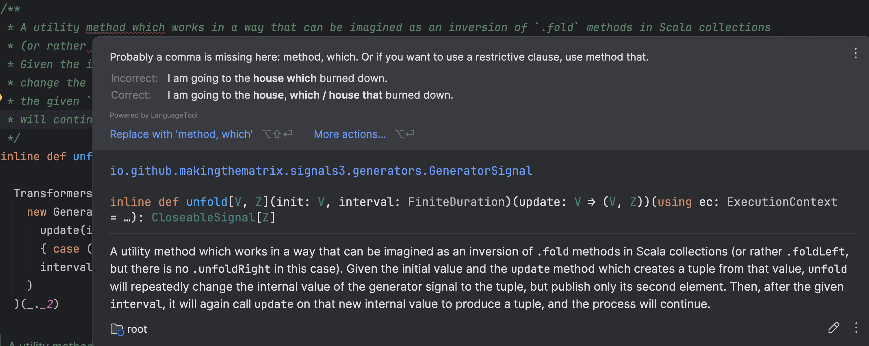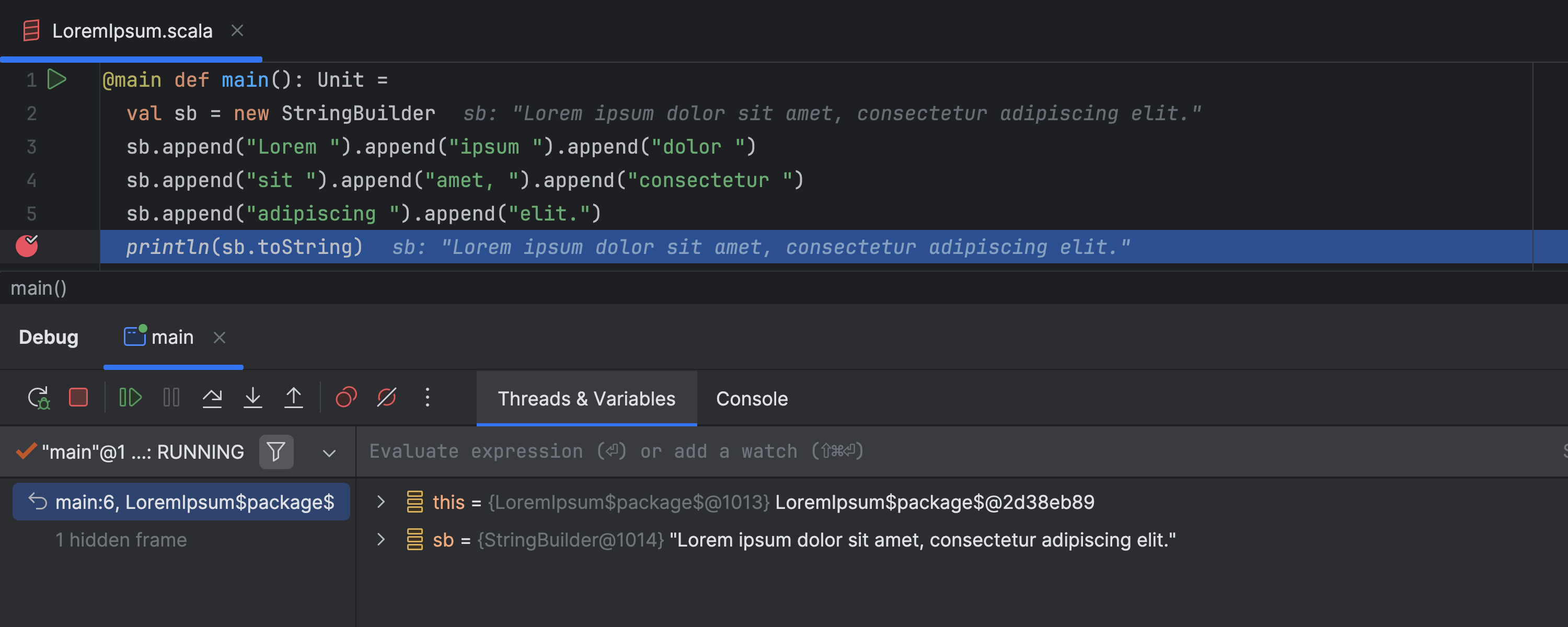 现在,StringBuilder 的内容在调试器中显示为字符串。 IntelliJ IDEA 还提供了 Scala 入门提示。 导入 sbt 项目时,将显示库下载进度。 此外,Scala 支持现在包括 Grazie 的功能,它在 Scala 注释中提供高级拼写和语法检查。