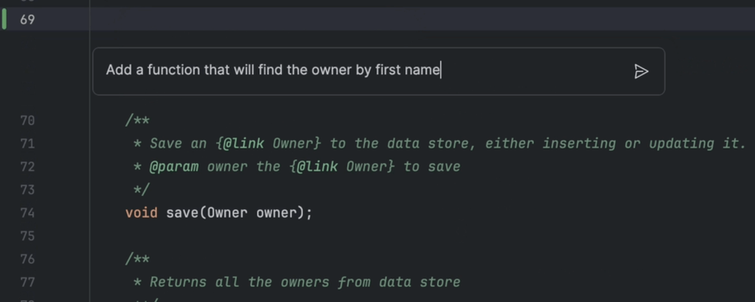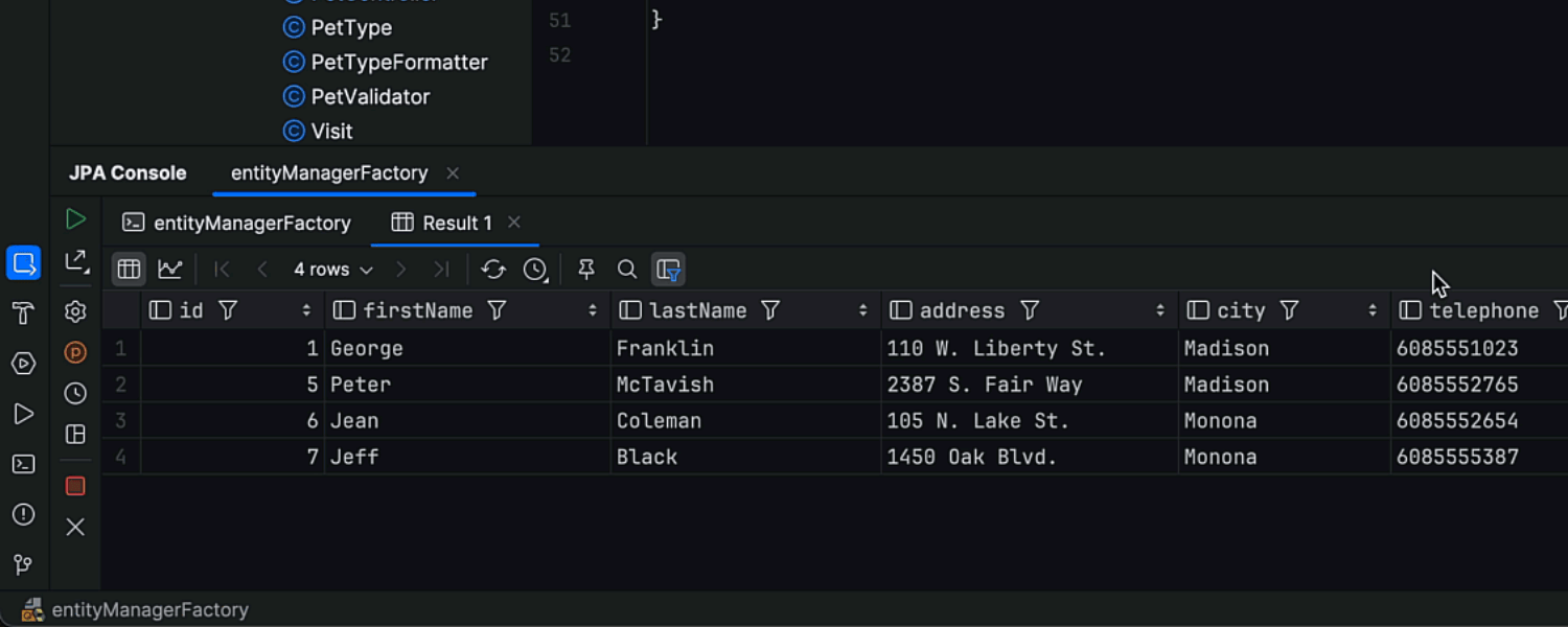 我们添加了在 IDE 中运行 Spring Data JPA 方法的功能,持续改进 IntelliJ IDEA 的 Spring 框架支持。 这项新功能允许您在不运行应用程序和分析日志文件的情况下查看方法将生成哪个查询。 现在,您可以使用装订区域图标直接在 JPA 控制台中执行任何仓库方法。