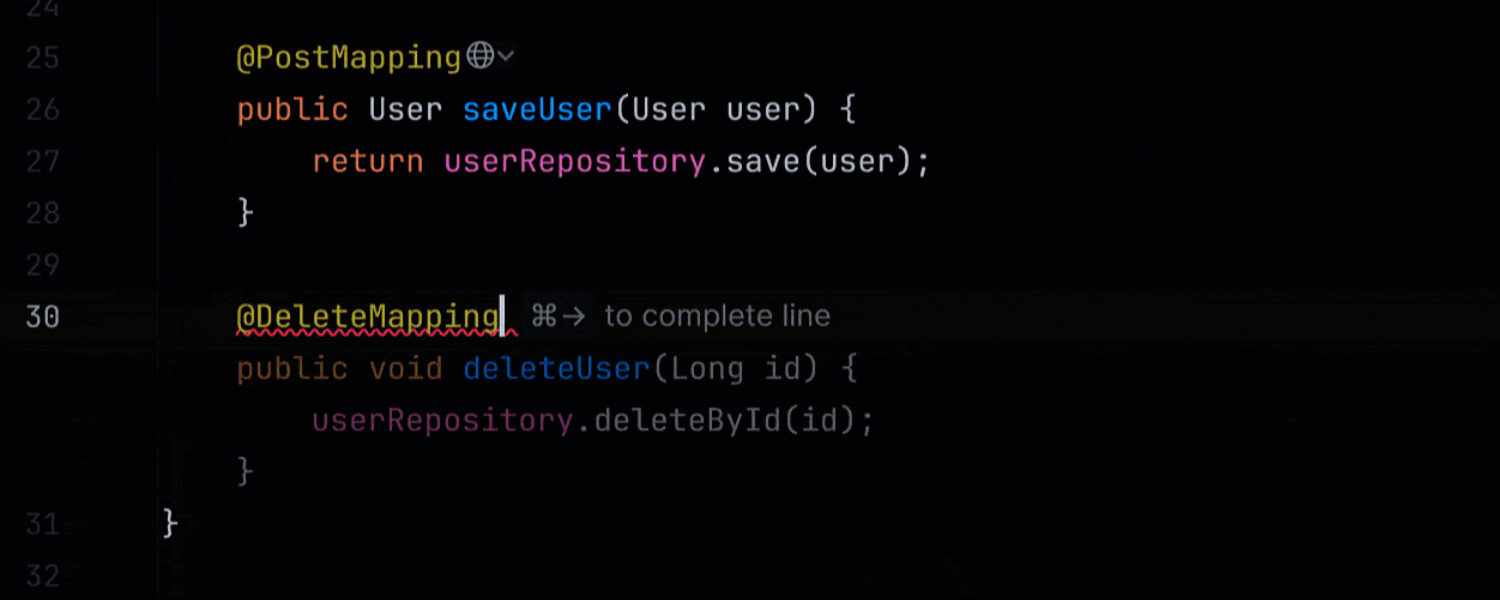 在 2024.2 版本中,我们使接受全行代码补全建议的流程更加直观和精确。 内联代码补全建议现在包含代码高亮显示,新的快捷键可以让您从较长的建议中接受单个单词或整个行。 我们还优化了将接受的更改集成到代码中的方式,消除了格式设置和相关问题。
