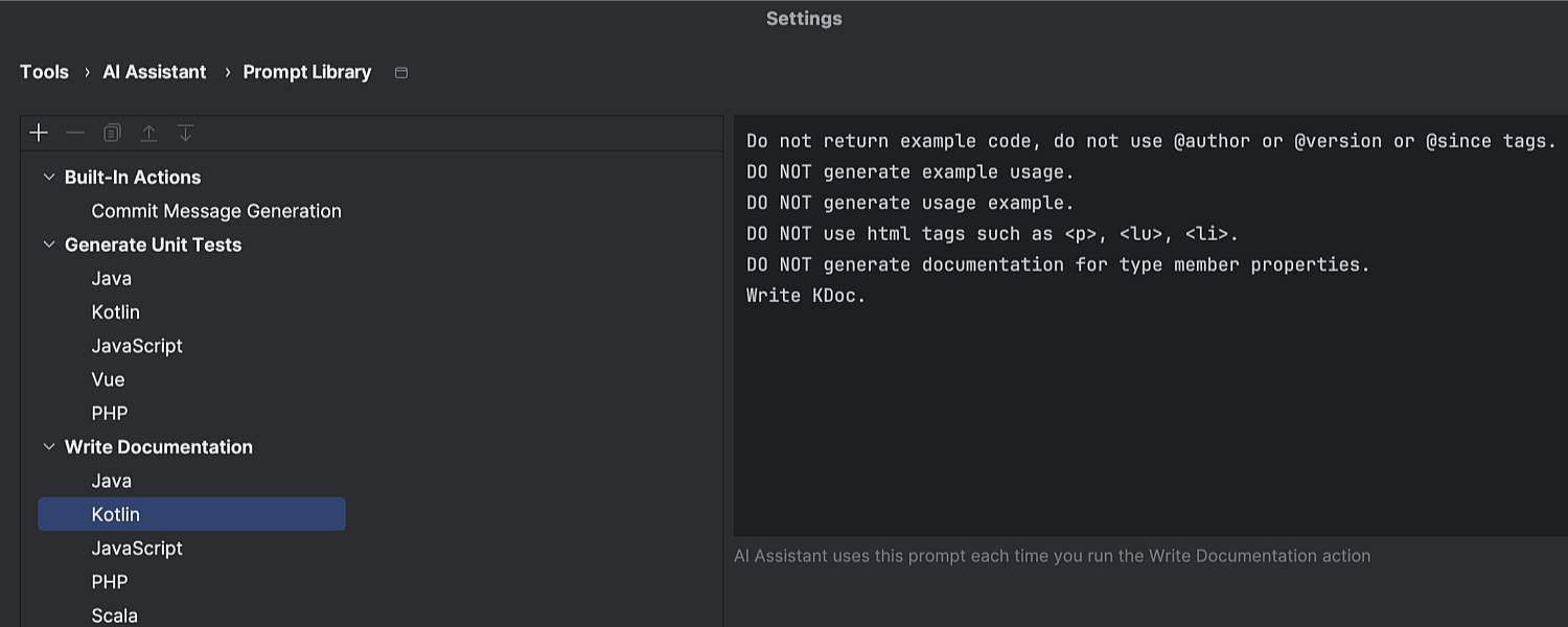 新功能包括 Terminal(终端)工具窗口中的 AI 集成和 AI 辅助 VCS 冲突解决。 此外,用户现在可以为文档生成和单元测试创建自定义提示。