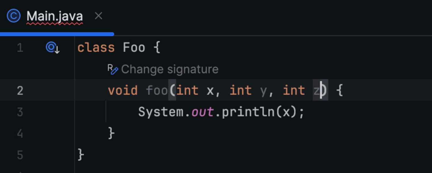 为了使 Change Signature(更改签名)重构更加易用和直观,我们在修改的代码元素附近添加了一个新的嵌入提示。 点击并确认更改时,IDE 会自动更新整个代码库中的所有相关方法引用。 这样可以确保一致并降低错误风险,简化重构流程。