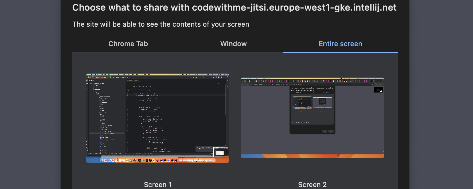 Code With Me 通话中的屏幕共享现在重定向到浏览器,允许您将特定窗口或整个屏幕指定为共享源。 此前,所有屏幕和窗口都默认共享,没有选择特定源的选项。