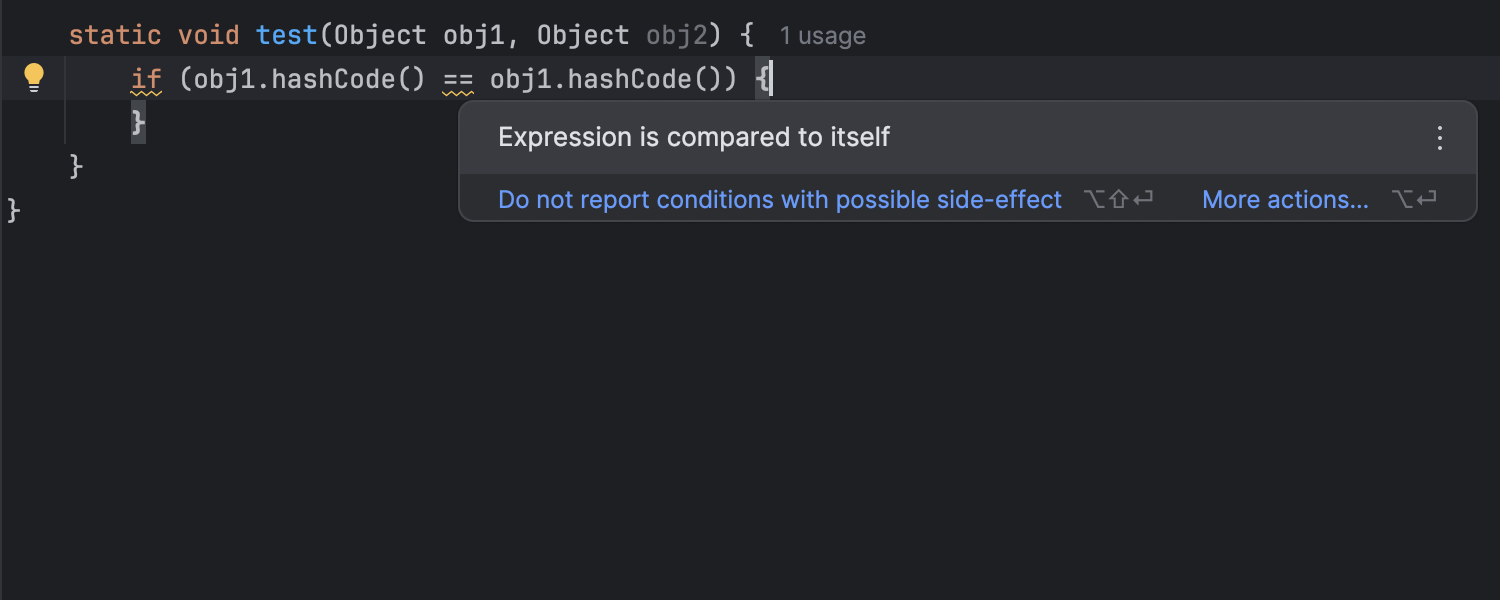 新检查会报告表达式与自身而不是另一个表达式比较的情况。 虽然这种比较有时是有意为之,但通常是疏忽所致。 此检查可以帮助您识别和解决这些潜在的意外比较,提高代码的准确性和可靠性。