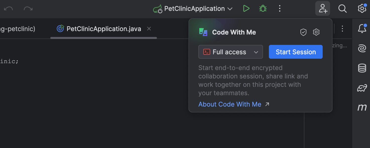 Code With Me 会话启动弹出窗口经过重新设计,使流程有所简化。 它现在包括所有权限设置,减少了启动新会话所需的步骤,并且权限得到保留,每个会话只需点击两次即可启动。 此外,权限可以在会话期间直接从弹出窗口更改。