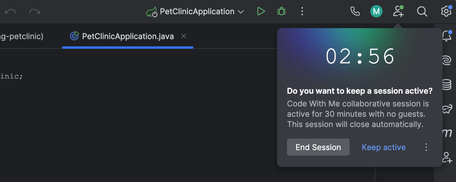 如果 30 分钟后没有人加入您的 Code With Me 会话,将会出现一个弹出窗口。 您可以选择结束会话、使其保持有效或关闭弹出窗口。 如果弹出窗口出现后三分钟内未采取任何操作,会话将自动结束。