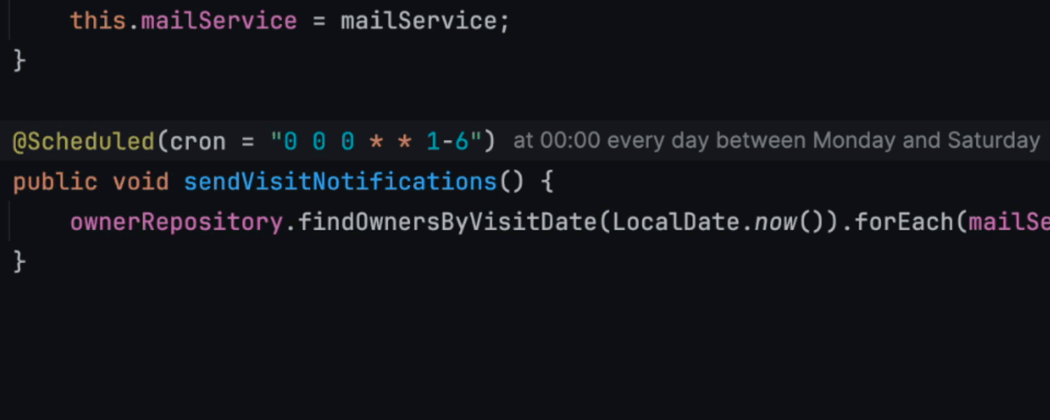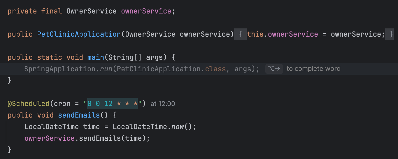 cron 表达式支持 在代码中处理 cron 表达式比以往更加简单。 使用 Spring、Quarkus 或 Micronaut 实现定时服务时,您可以通过紧邻的描述轻松理解 cron 表达式。 此外,自动补全功能提供了您可以立即添加和调整的预填充示例,不必从头开始编写 cron 表达式。