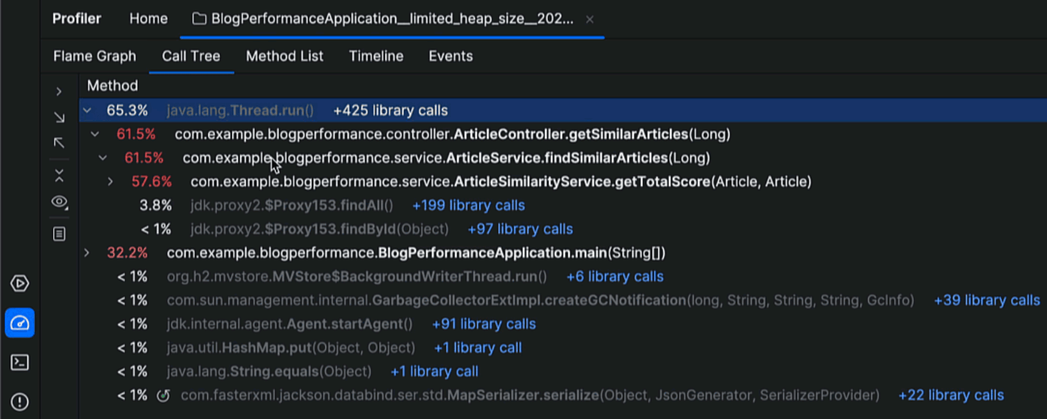 IntelliJ IDEA 的内置分析器已经升级,有助于简化性能瓶颈调查。 现在,IntelliJ IDEA 在分析器中淡出和收起库调用来进一步强调您的代码。 这可以确保您将数据专注于项目中对应用程序性能影响最大的调用上,筛选掉不需要您注意的方法。 如需库调用的详细视图,您可以展开隐藏的调用以显示整个调用序列和对应执行时间。 点击调用旁边的超链接或 + 图标即可进一步探索。
