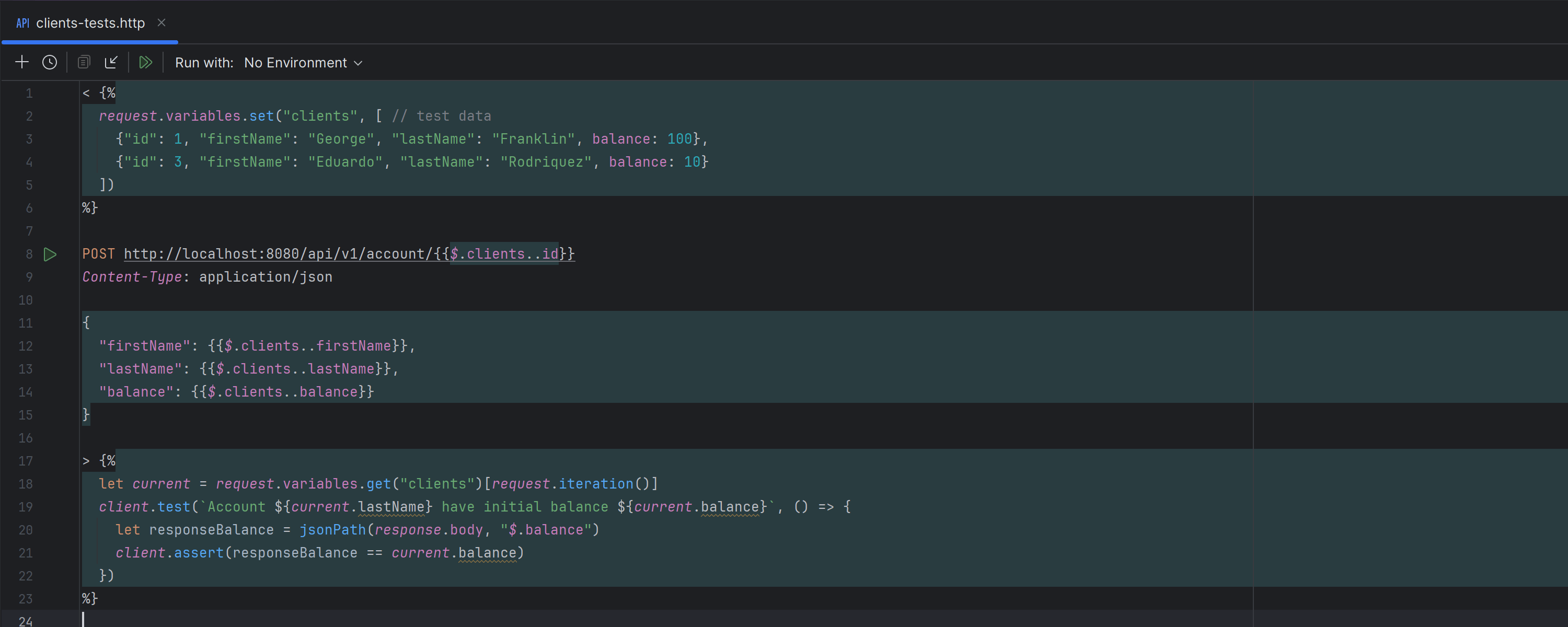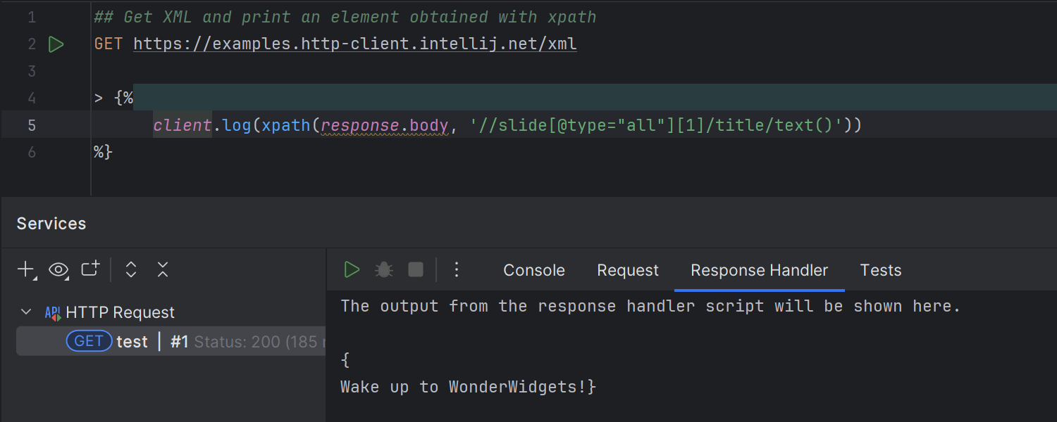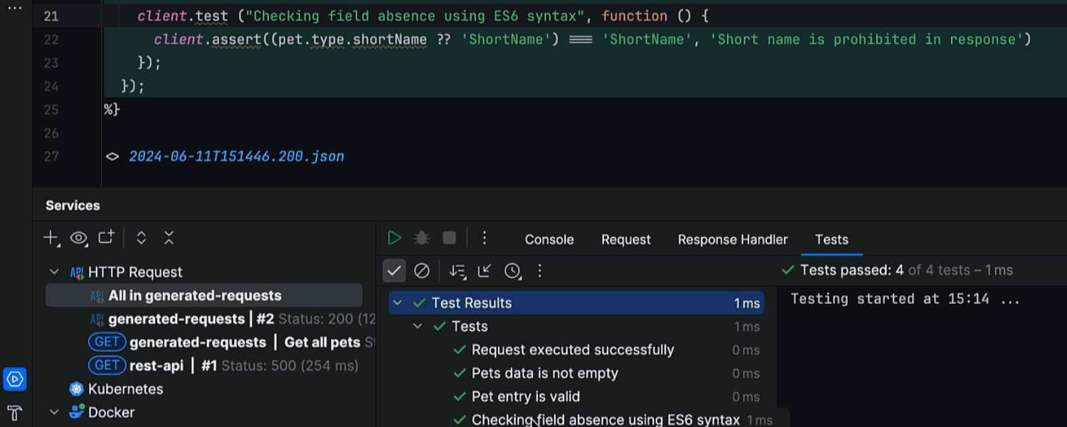 我们已将 HTTP 客户端中使用的 JavaScript 执行引擎升级为 GraalJS。 这让您可以在使用 IntelliJ IDEA 的 HTTP 客户端测试端点以及在 .http 文件中使用 JavaScript 处理结果时使用所有 GraalJS 功能,包括对 ECMAScript 2023 规范的完全支持。