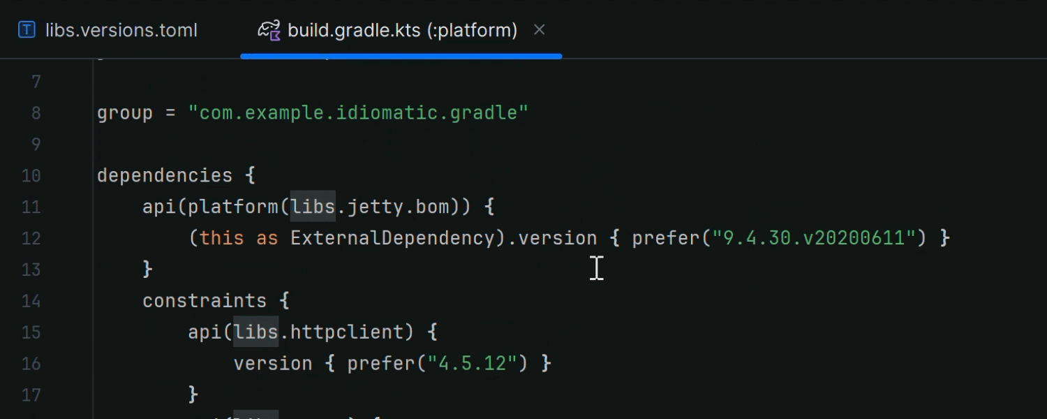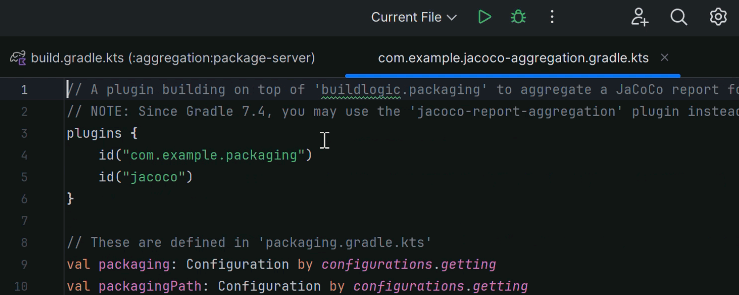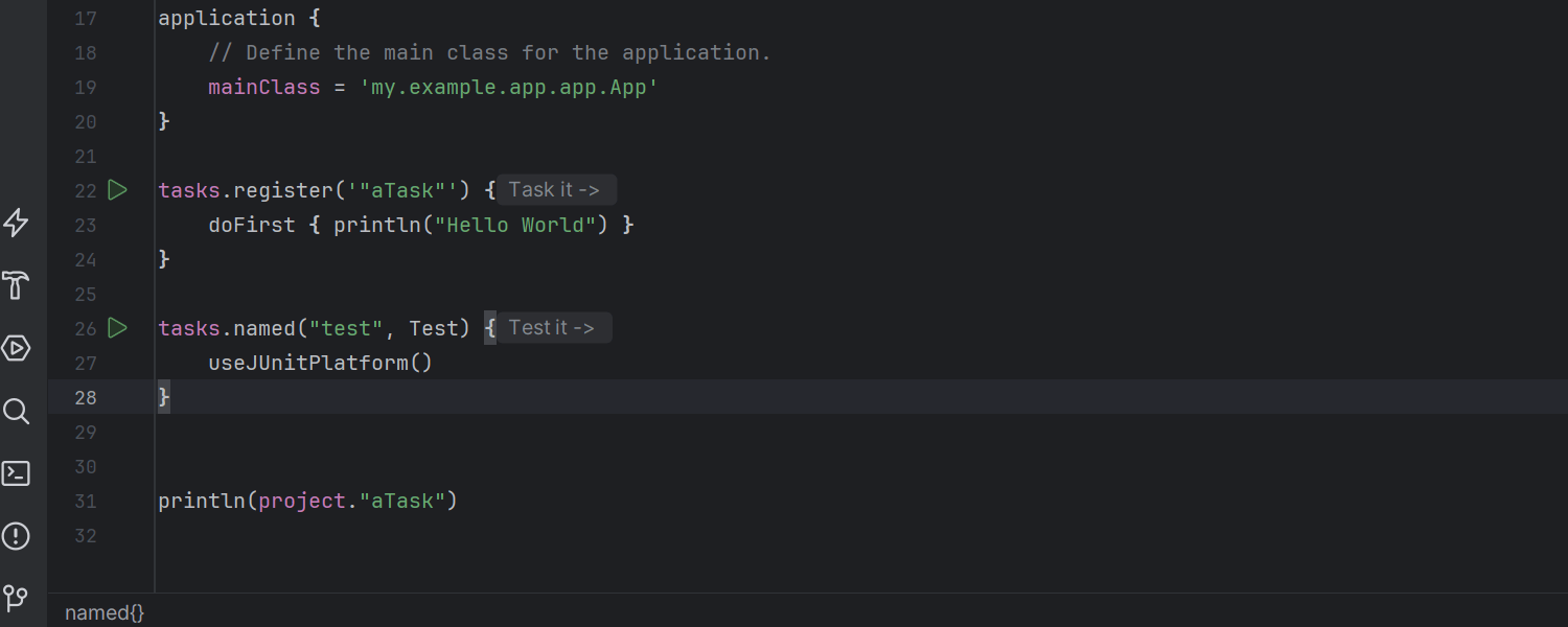 IntelliJ IDEA 2024.2 为 Gradle 构建脚本提供了新的导航和高亮显示功能。 首先,IDE 现在为构建脚本中声明的 Gradle 插件提供了流畅、准确的导航。 此外,我们还实现了版本目录文件和 libs.versions.toml 文件中的构建脚本之间的导航,以及直接从装订区域运行已注册任务的选项。