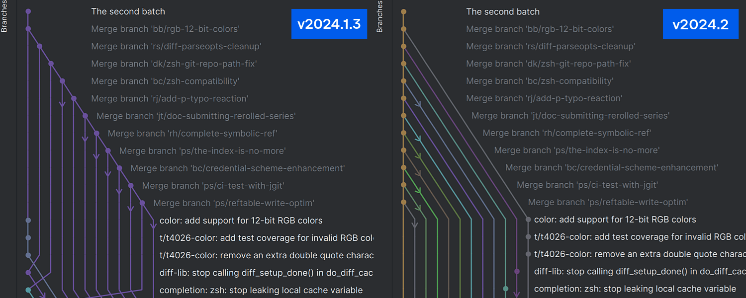 我们优化了 Git 工具窗口 Log(日志)标签页中提交图的分支线的颜色编码和布局。 重要的分支行现在始终位于图表左侧,并维持其指定颜色,更易识别和跟踪。