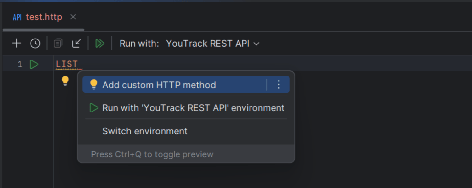 我们还简化了提供特定方法的 API 的使用。 要使用这些 API,您可以通过快速修复动态添加自定义方法,或者在 Settings/Preferences | Tools | HTTP Client(设置/偏好设置 | 工具 | HTTP 客户端)中使用逗号分隔的列表输入。