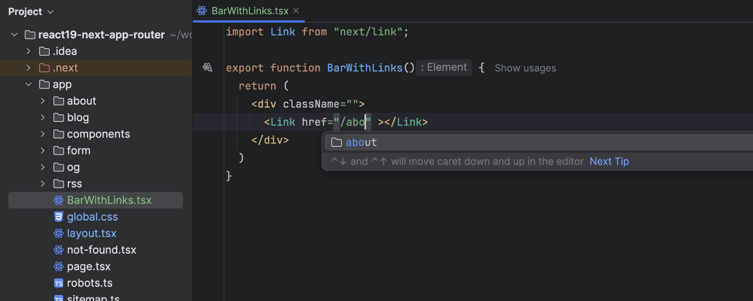 IntelliJ IDEA Ultimate 2024.2 能够为使用基于文件系统的路由的框架解析路径。 它可以根据项目的文件系统解析链接路径,为 Next.js、Nuxt、SvelteKit 和 Astro 提供自动补全和导航。 还有对新 Svelte 5 代码段和渲染标记的支持。 此外,我们还为 Astro 和 Vue Language Service v2 实现了语言服务器协议 (LSP) 支持,有助于提升代码补全和整体开发者体验。