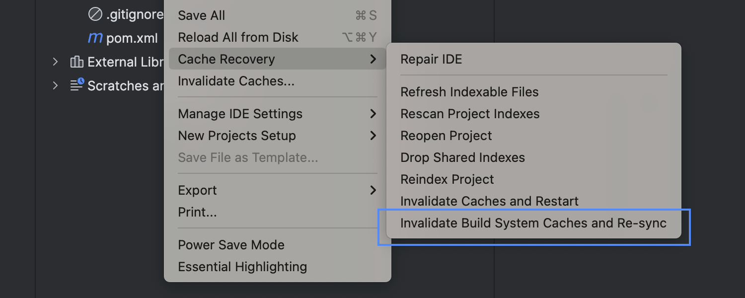 您现在可以清除构建系统缓存,从而立即解决与 Maven、Gradle 或 sbt 项目的结构相关的问题,例如由不正确的数据导入导致的问题。 您可以通过 File | Cache Recovery | Invalidate Build System Caches and Re-sync(文件 | 缓存恢复 | 使构建系统缓存失效并重新同步)访问此操作。