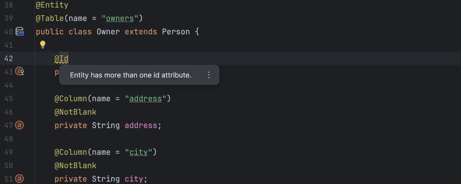 我们通过多项新检查扩展了 IntelliJ IDEA Ultimate 的 JPA 支持。 这些增强使 IDE 能够检测和修正在将 Lombok 注解与 JPA 实体一起使用时可能导致性能下降或运行时错误的问题。 IDE 还可以识别 Spring Data JPA 仓库中缺少的形参,检查是否所有关联都被正确标记,并检测 @ManyToMany 关联的 CASCADE 形参来防止意外删除。