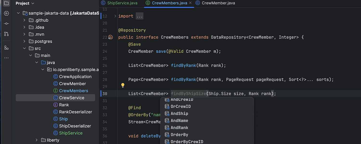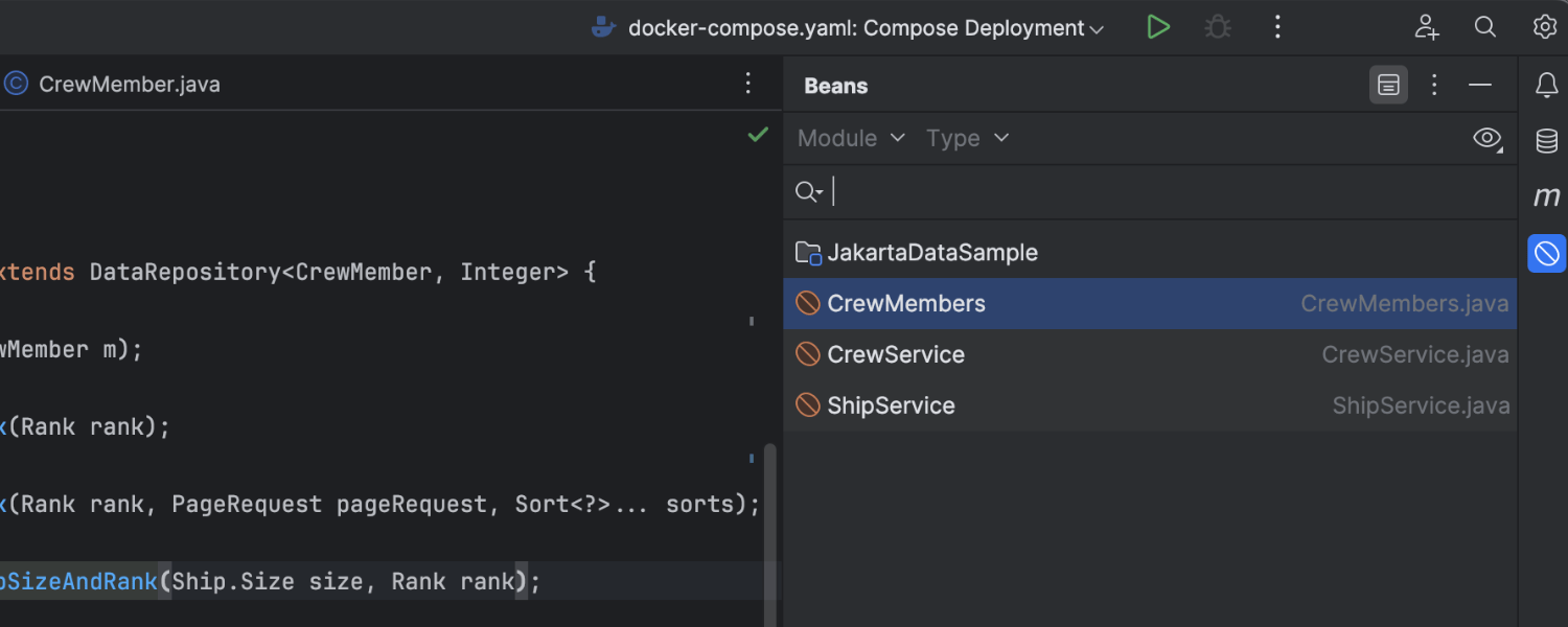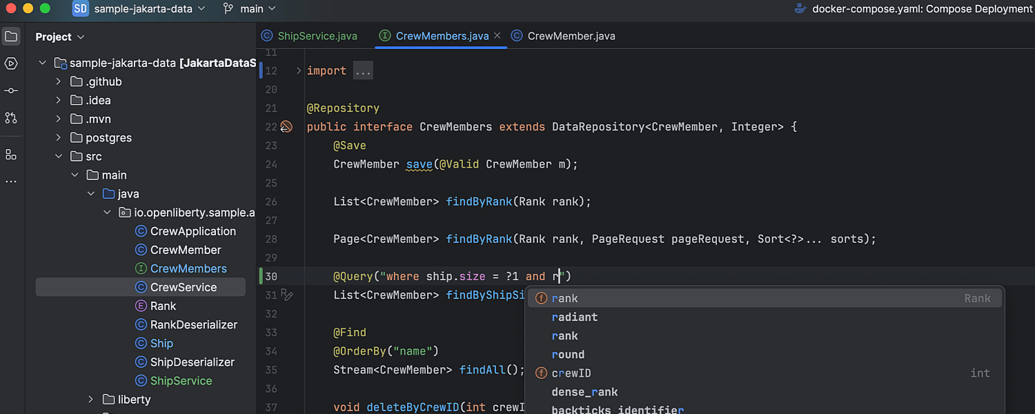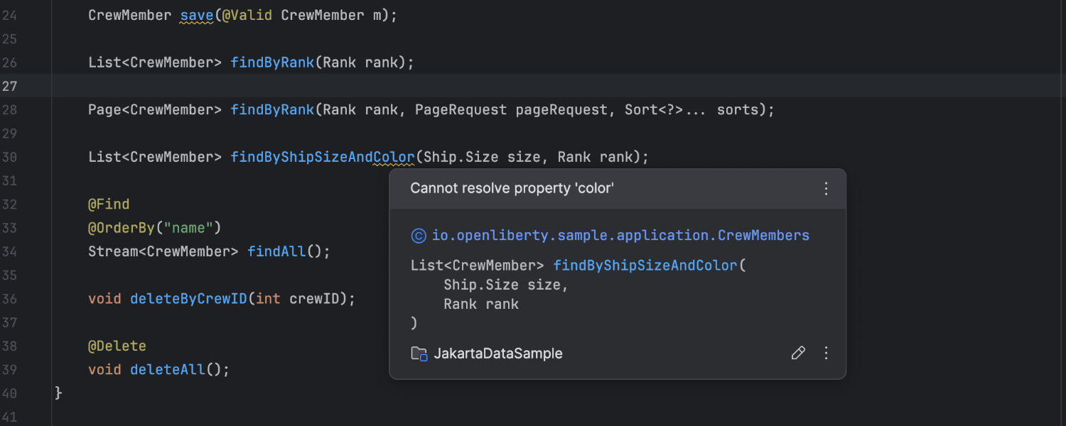 在 IntelliJ IDEA Ultimate 2024.2 中,我们引入了对 Jakarta Data 的支持。 IDE 现在可以为仓库提供编码辅助和检查,包括基于数据模型的方法名称补全和验证以及基于方法名称的形参验证。 Jakarta Data 仓库在 Bean 工具窗口中显示以简化导航。 此外,还有 Jakarta 查询语言支持,提供基于数据模型的语法高亮显示、语句验证和语句自动补全。