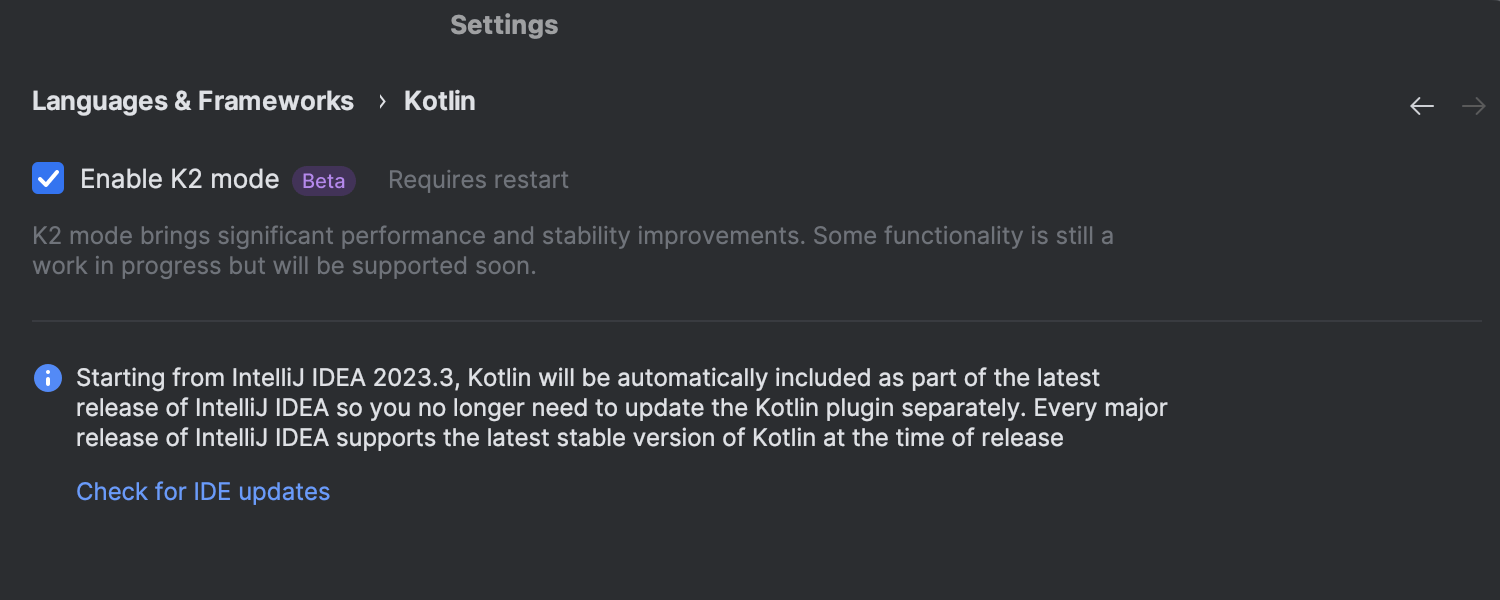 IntelliJ IDEA 2024.2 改进了 K2 模式,这种新的 Kotlin 支持机制为未来的 Kotlin 语言功能奠定了基础,也增强了 IDE 的稳定性和性能。 在 2024.2 版本中,K2 模式现在支持 gradle.kts 脚本、Kotlin Multiplatform (KMP) 项目、所有主要重构、代码高亮显示、调试等。 基准测试表明,K2 模式使 IntelliJ IDEA Ultimate 源库上的代码高亮显示性能几乎翻了一番。 要将其激活,请转到 Settings/Preferences | Languages & Frameworks | Kotlin(设置/偏好设置 | 语言和框架 | Kotlin)。 了解详情.