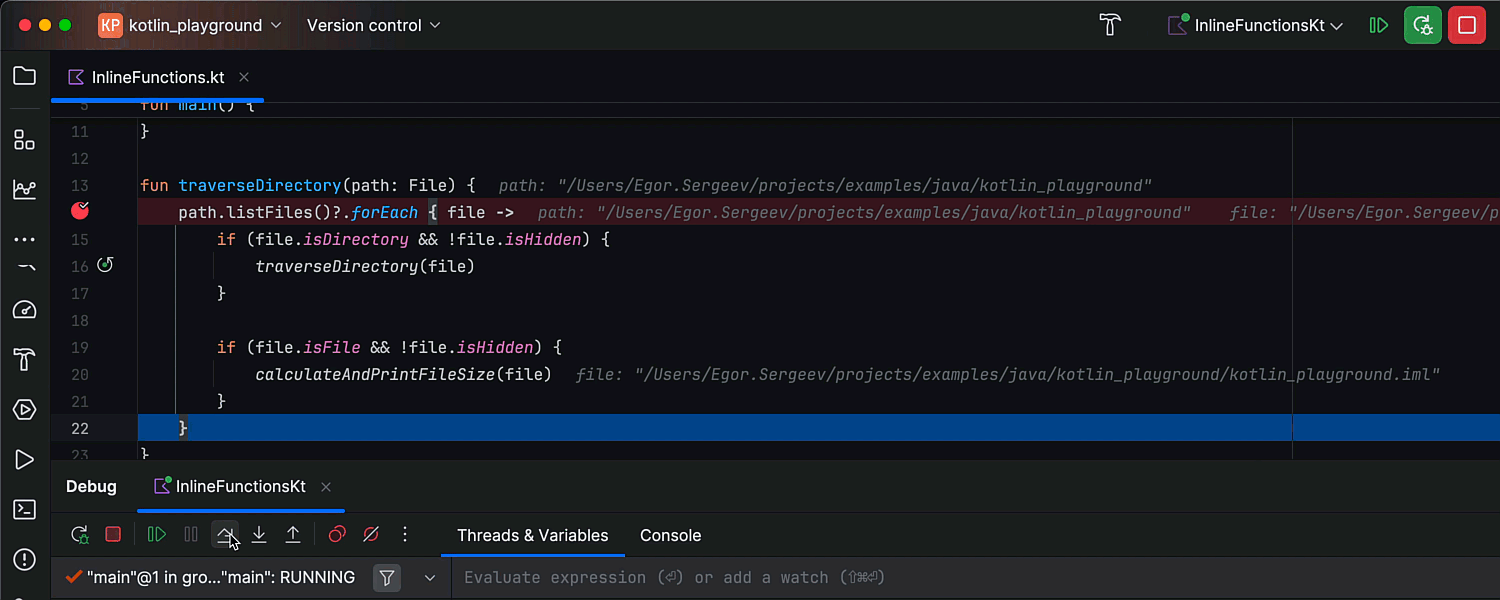 IntelliJ IDEA 2024.2 为 Kotlin 调试体验带来了重大改进。 您现在可以使用 Step Over(步过)来迭代 forEach 循环并进入内联函数 lambda,无需跳过重要代码。 您不再需要记住对内联函数使用 Step Into(步入),这有助于确保您不会错过代码的关键部分。 现在,您可以逐步执行 forEach、let 和 filter 内联函数,就像逐步执行常规循环和条件一样。