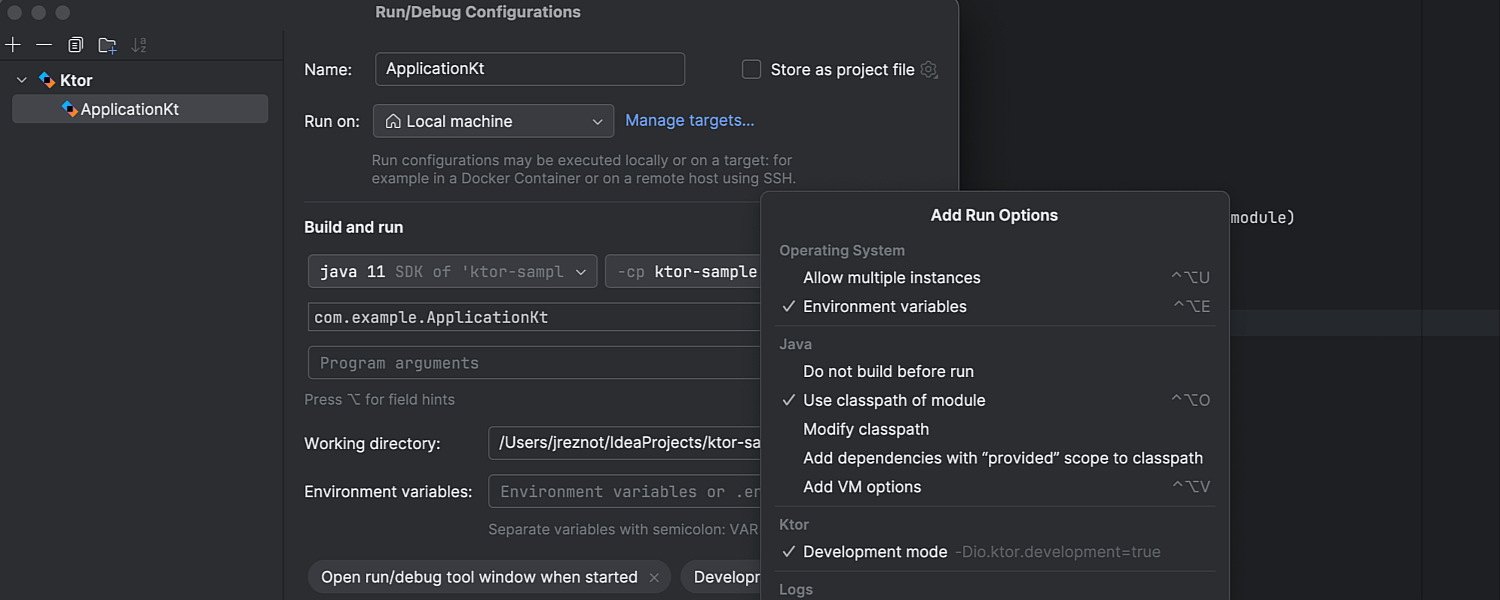 IntelliJ IDEA 2024.2 支持在运行配置中轻松启用 Ktor 的开发模式。 现在,创建新的运行配置时此模式会默认设置,并且可以在更新的 Run/Debug Configurations(运行/调试配置)对话框中管理。 此外,我们还使此对话框的 UI 更加简洁,对 Ktor 用户更加友好。