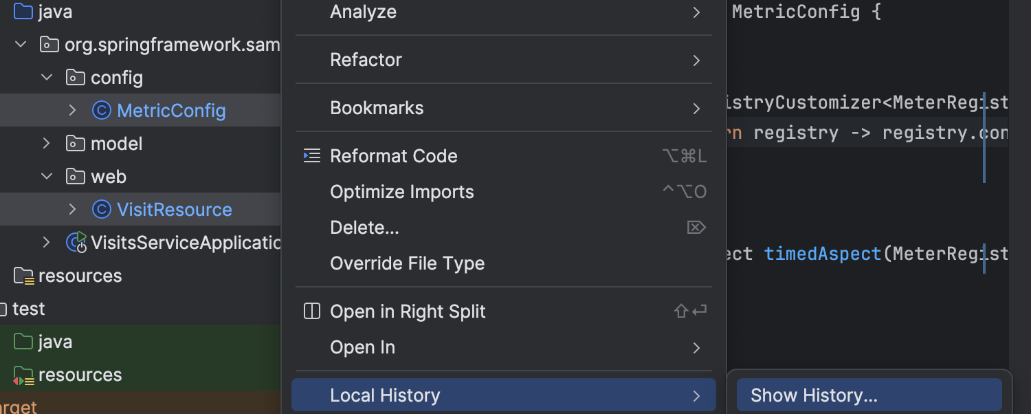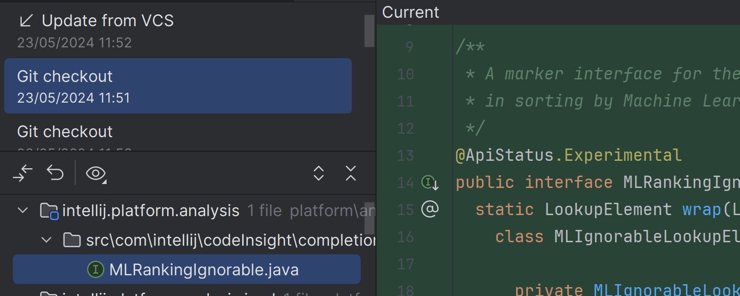 我们对 Local History(本地历史记录)对话框 UI 进行了现代化改进。 此外,访问目录时,对话框现在会在更改列表旁边显示差异视图,使其更易理解。 为了简化复杂项目中的更改检查,我们使 Local History(本地历史记录)操作可同时用于多个文件或目录。 在 Project(项目)工具窗口中,选择多个文件或文件夹,然后选择 Local History | Show History(本地历史记录 | 显示历史记录),查看包含您选择内容的更改历史记录的弹出窗口。