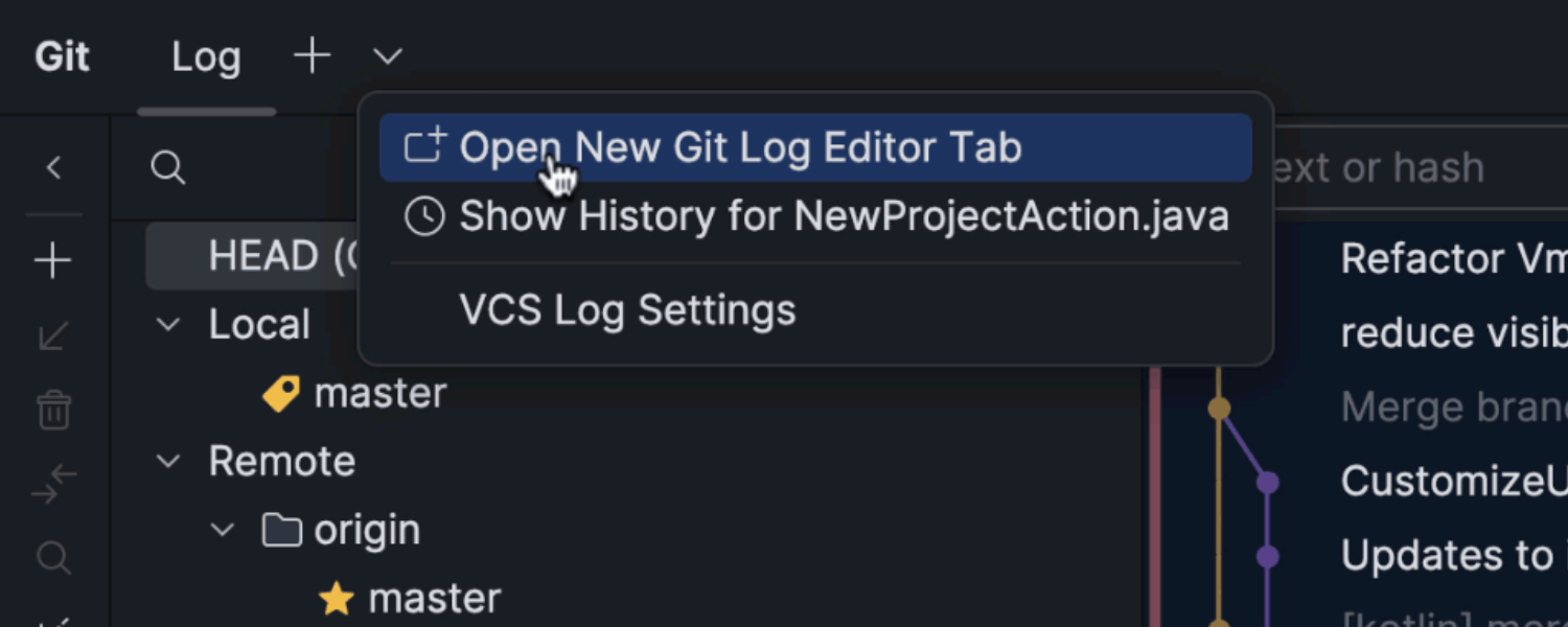 所有与 Log(日志)工具窗口相关的设置都已合并到一个专属设置页面中,您可以通过 Settings/Preferences | Version Control | Log(设置/偏好设置 | 版本控制 | 日志)或 Log(日志)工具窗口工具栏上的新增下拉菜单访问。 此外,您现在可以将 Git 日志作为编辑器中的标签页打开,从而提供更多的工作空间,并更轻松地浏览提交列表和相关详细信息。 此操作也可以通过 Log(日志)工具窗口工具栏中的下拉菜单执行。