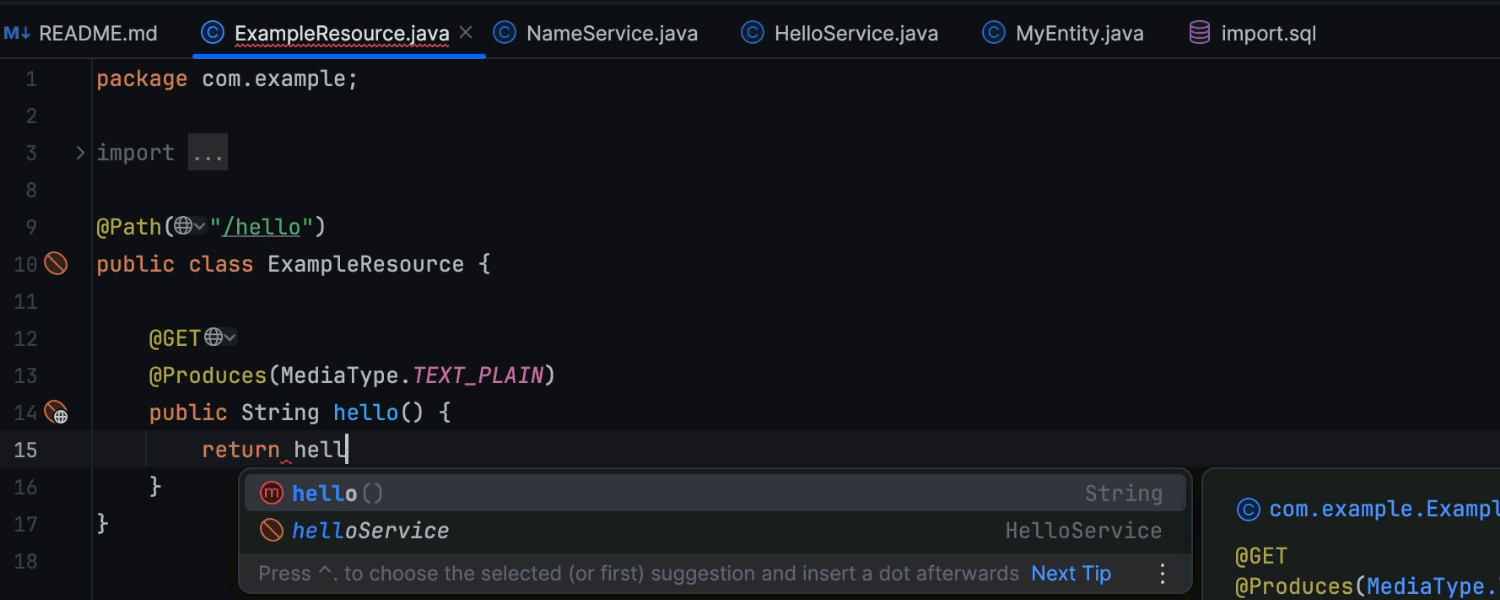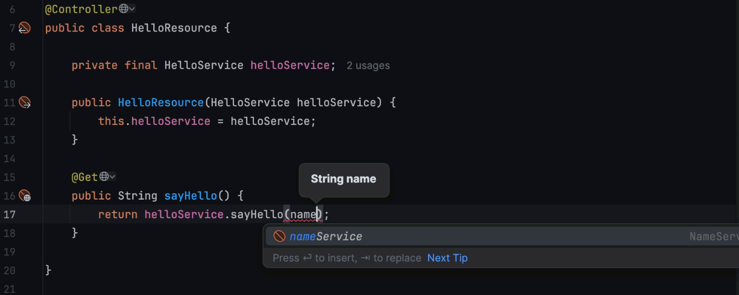 IntelliJ IDEA Ultimate 现在为 Quarkus 和 Micronaut 应用程序提供 Bean 自动补全和注入。 需要将 Bean 注入到代码中时,输入其名称并从代码补全弹出窗口中选择即可。 IDE 将根据您的代码样式自动添加带有 @Inject 注解的构造函数形参或字段。