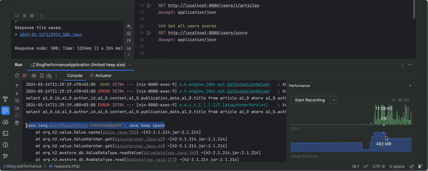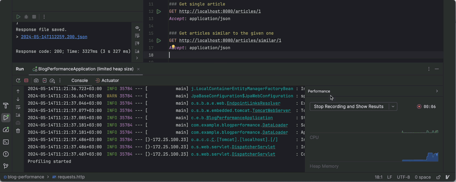 为了使性能分析更快、更高效,我们在 Run(运行)工具窗口中实现了新的 Performance(性能)标签页。 新的标签页提供实时 CPU 和内存图表,并允许您捕获代码的执行时间并直接在编辑器中查看来查明性能瓶颈。 此外,您还可以捕获内存快照来检查对象并找出内存泄漏的根本原因。