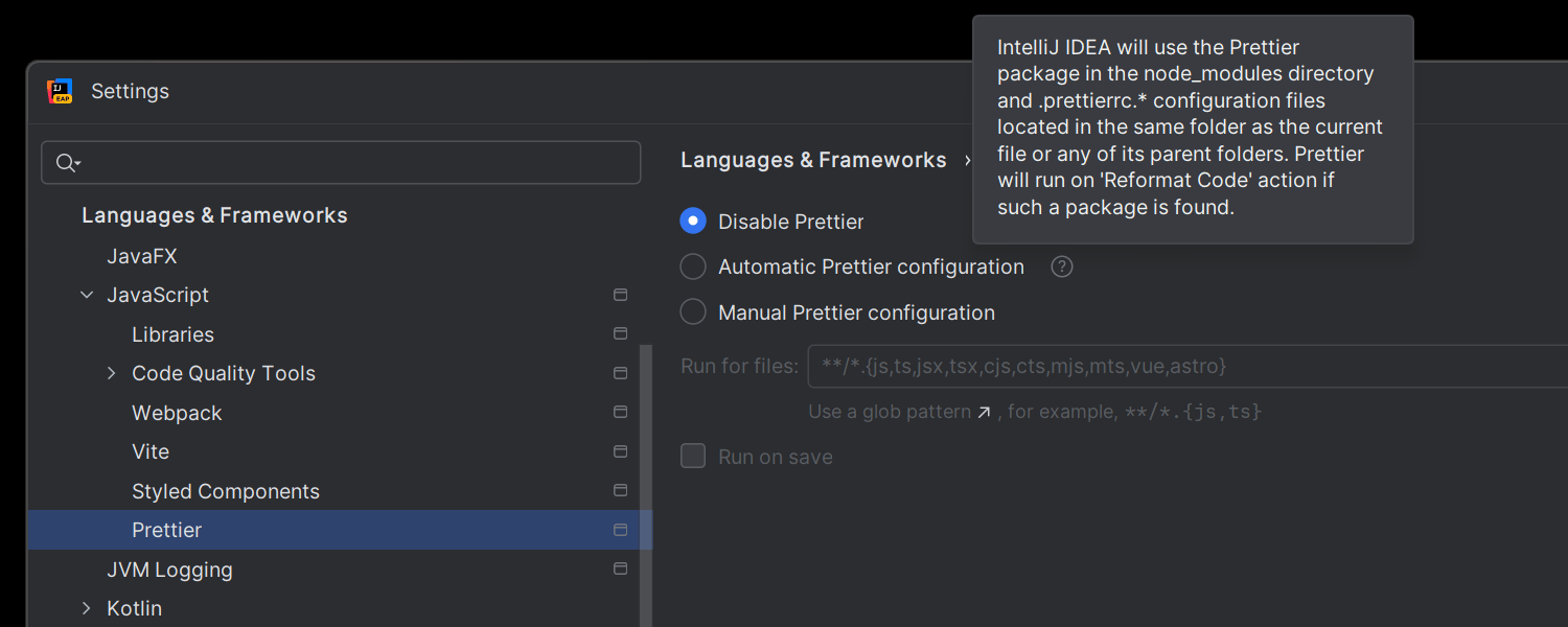 在 IntelliJ IDEA Ultimate 2024.2 中,Prettier 集成会在新项目中启用,它们的根 package.json 中具有直接 prettier 依赖项,并且在同一级别具有 Prettier 配置文件。 这项功能简化了设置流程并确保 Prettier 集成开箱即启用。