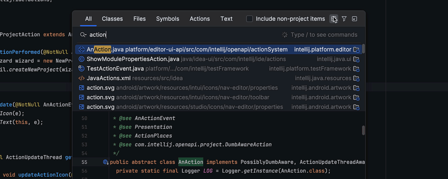 Search Everywhere(随处搜索)对话框增加了一个选项,用于预览您正在搜索的代码库元素。 通过对话框工具栏上的 Preview(预览)图标启用此功能后,预览窗格将出现在搜索结果下方,提供更多上下文并让您更轻松地浏览项目。