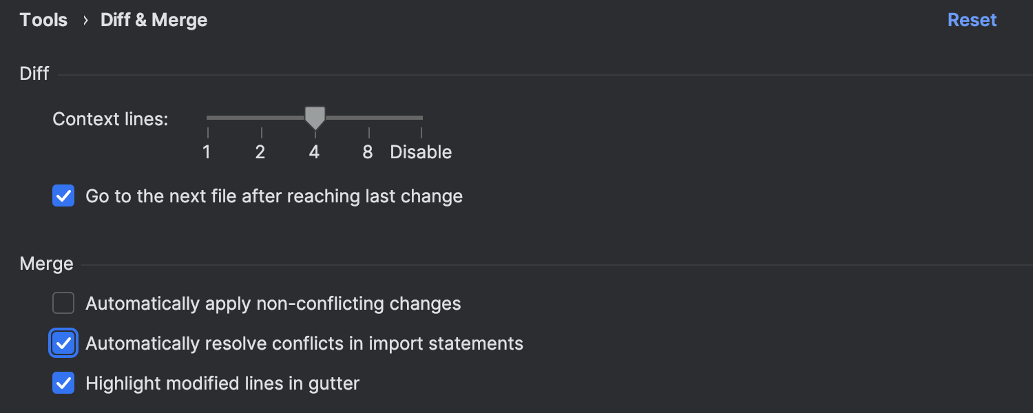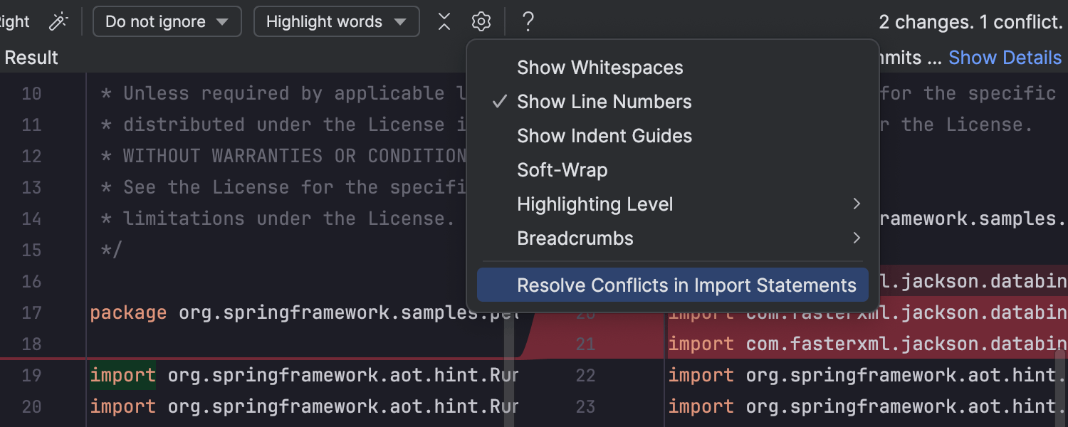现在,您可以轻松识别和解决 Java 和 Kotlin 的 import 块中的冲突。 在 Merge(合并)窗口中,点击齿轮符号并选择 Resolve Conflicts in Import Statements(解决 import 语句中的冲突)。 此外,您可以在 Settings/Preferences | Tools | Diff & Merge(设置/偏好设置 | 工具 | 差异与合并)中将 IDE 设为自动解决 import 语句中的冲突。