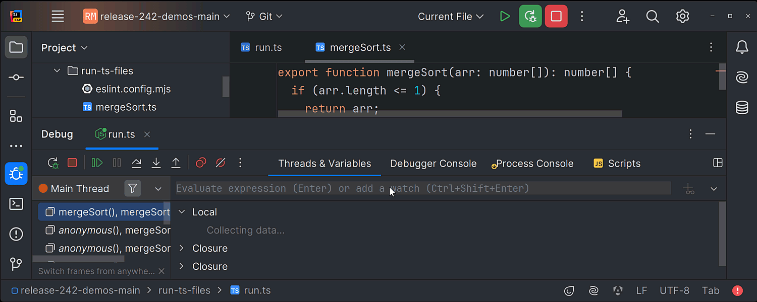 现在,运行和调试 TypeScript 文件无需任何额外设置。 您可以从不同的入口点执行,包括文件上下文菜单、Run(运行)微件,甚至 Current File(当前文件)配置。