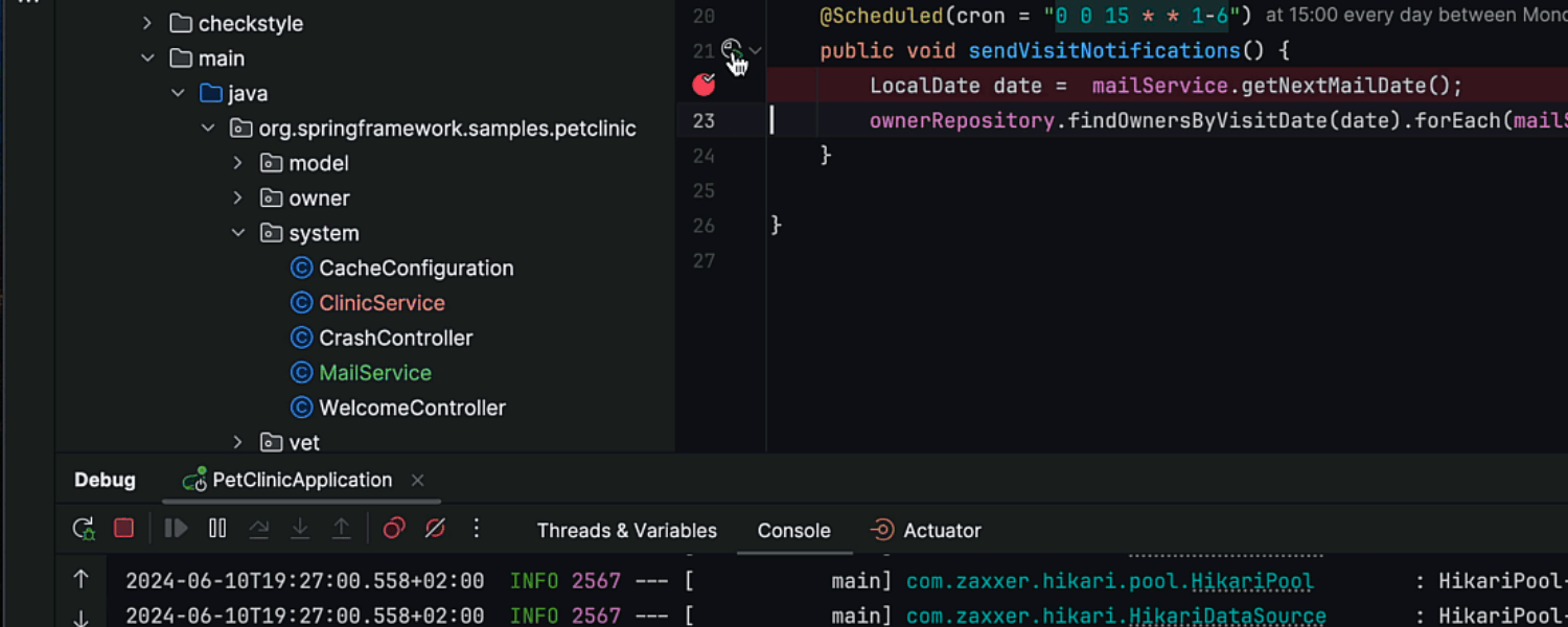 @Scheduled 方法 IntelliJ IDEA 2024.2 Ultimate 具有针对 Spring Boot 中异步 @Scheduled 方法的调试功能。 这项更新消除了手动调整方法时间表并等待其启动的需要。 设置一个断点,根据需要直接从 IDE 触发方法执行即可。