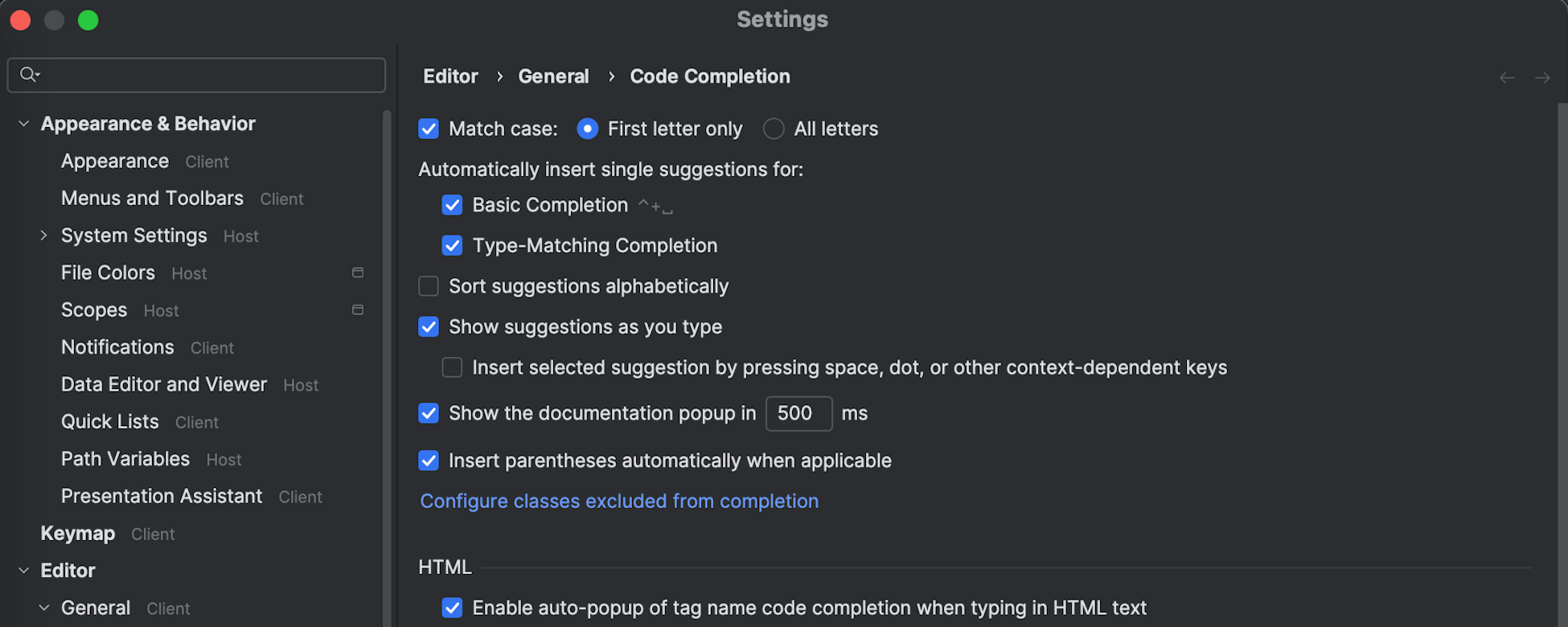 JetBrains 客户端和您的桌面 IDE 现在共享相同的设置,因此在本地安装的 IDE 中所做的任何设置更改都会通过 JetBrains 客户端自动与远程 IDE 同步,确保您的开发环境保持一致。 共享设置的作用域已扩展到包括控制台、调试器和智能按键配置等。