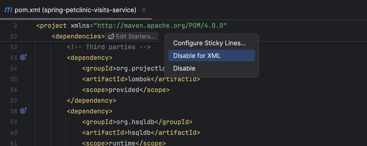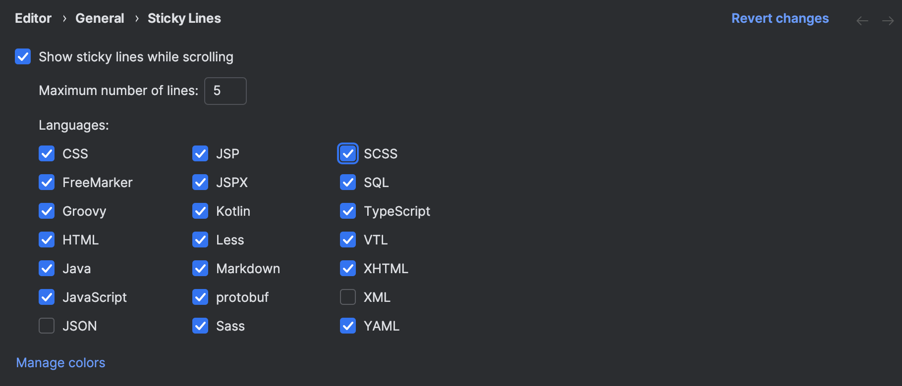 现在,您可以选择要为其显示粘性行的语言。 您可以在 Settings/Preferences | Editor | General | Sticky Lines(设置/偏好设置 | 编辑器 | 常规 | 粘性行)中根据自己的偏好定制功能,或者在编辑器中右键点击粘性行调用上下文菜单。