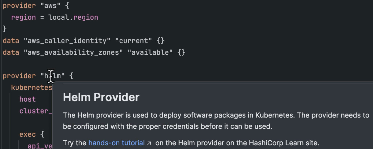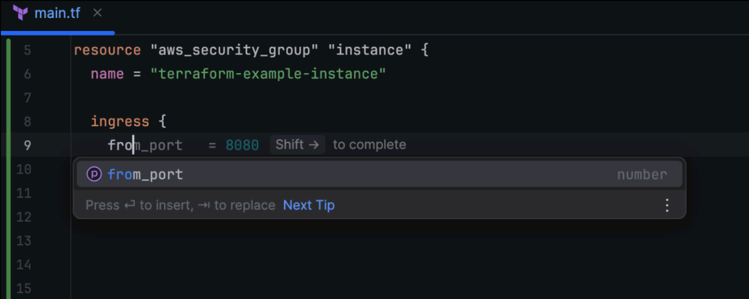 我们显著扩展了 IntelliJ IDEA Ultimate 对 Terraform 的编码辅助,为其提供了全行代码补全。 此外,关键代码洞察功能也针对 Terraform 进行了改进,例如上下文感知代码补全、精细的语法高亮显示以及带有快速修复建议的错误检测系统。 我们还添加了一个快速文档功能,当您将鼠标悬停在元素上时会显示工具提示,提供即时信息来帮助您更有效地使用 Terraform 资源,而不会中断您的工作流。