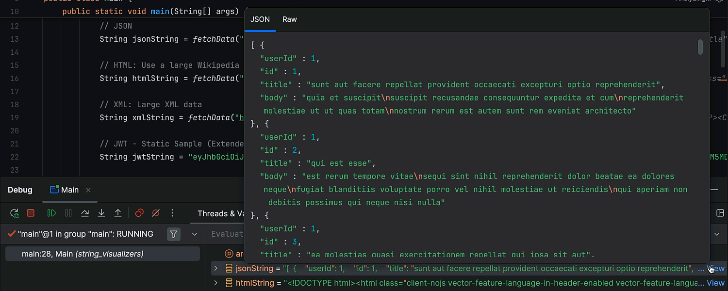 现在,调试和浏览具有复杂数据格式的长字符串变量变得容易多了。 更新后的调试器为具有以 JSON、XML、HTML、JWT 和 URL 编码的字符串的字符串变量提供了格式正确的可视化效果。 只需点击变量旁边的 View(查看)超链接,相关的可视化器便会根据变量的内容自动选择。