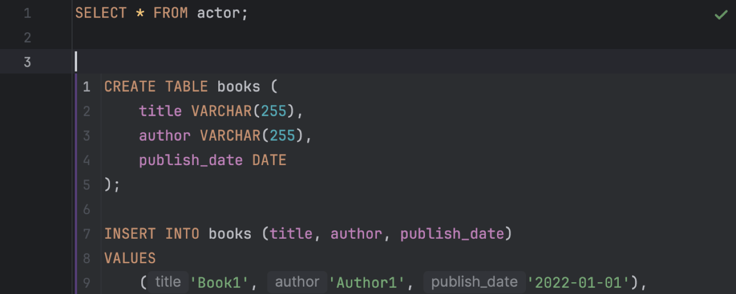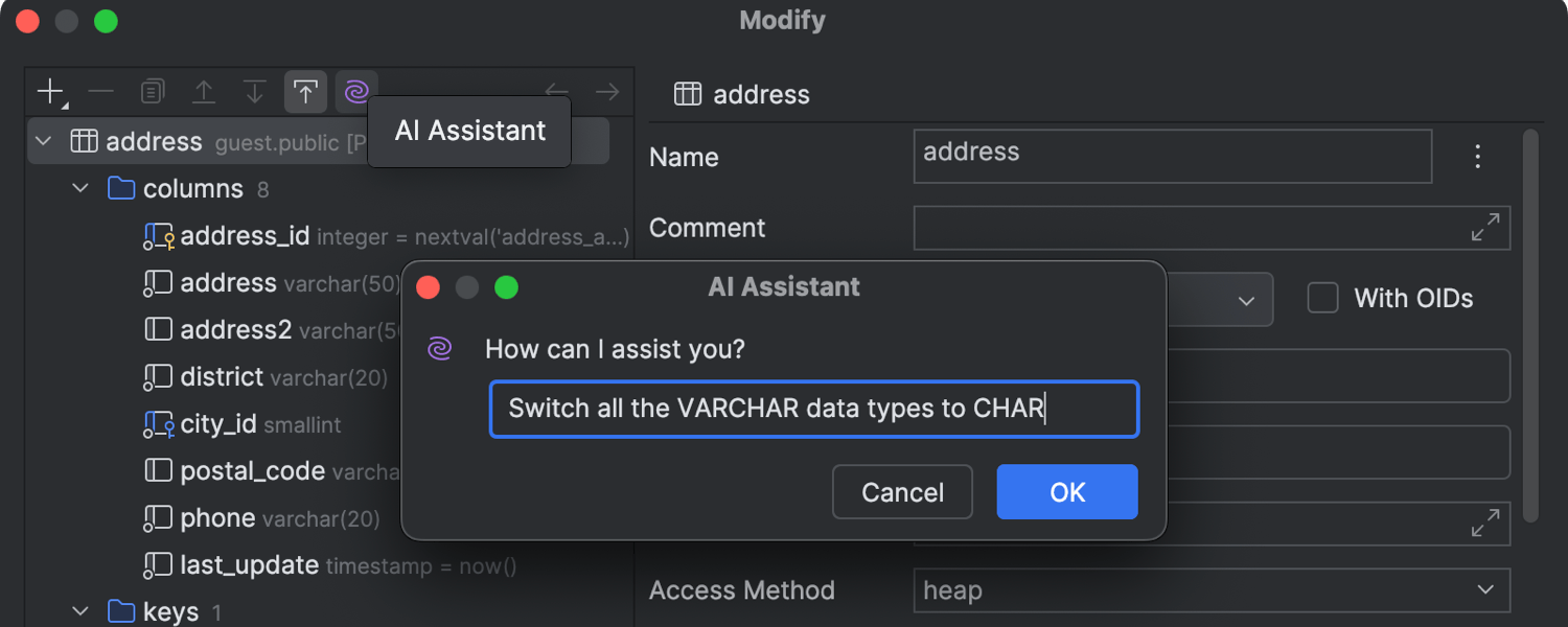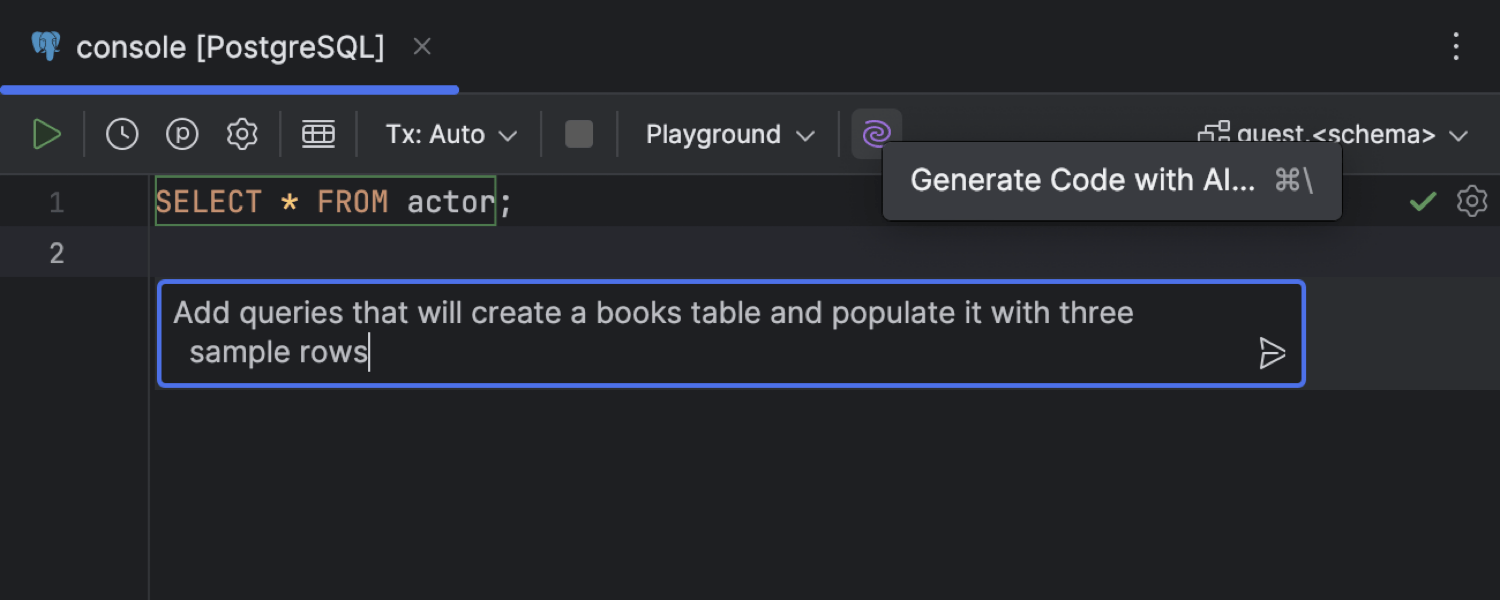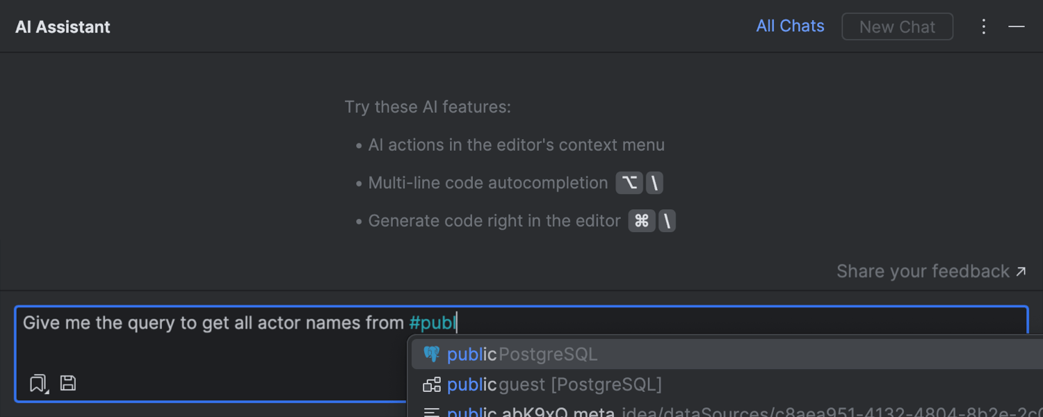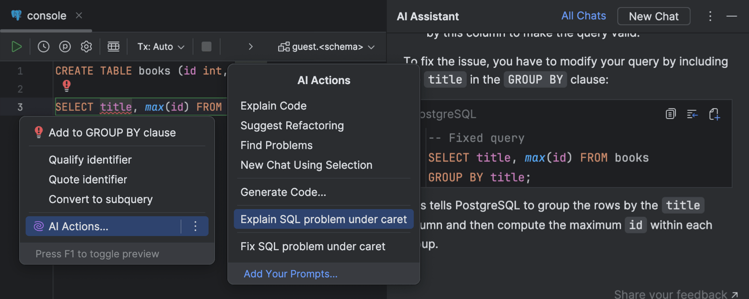 在这个版本中,我们为数据库引入了新的 AI Assistant 功能。 借助文本到 SQL 功能,您可以点击 Generate Code with AI(使用 AI 生成代码)并输入提示直接在编辑器中生成 SQL 代码。 您可以接受、重新创建或优化代码,如果有其他问题,可以将其带到 AI 聊天。 此外,AI Assistant 可以帮助修改表,允许您请求更改,例如将所有 VARCHAR 数据类型切换为 CHAR。 它还可以帮助您理解和修正 SQL 问题,并提供解释和修正建议。 您可以输入 # 后跟要添加到提示中的数据库架构的名称,将数据库架构附加到 AI 聊天。