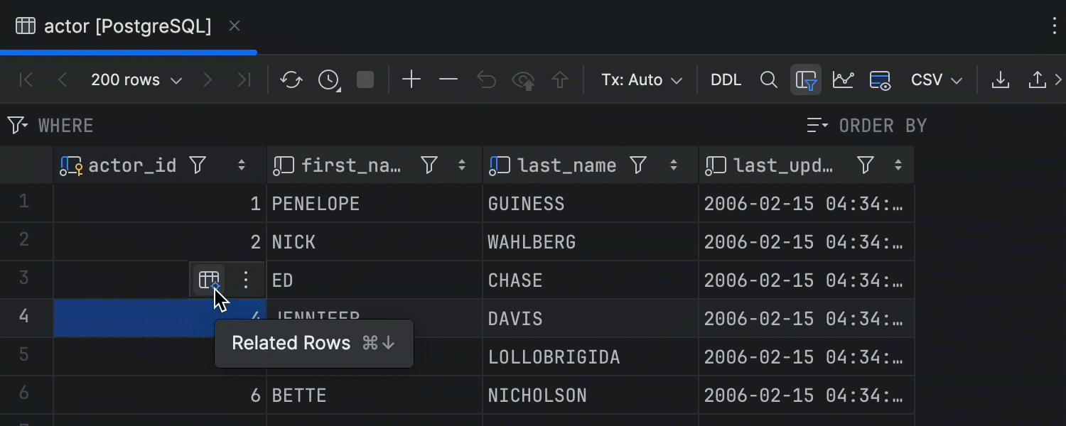 现在,您可以选择单元,然后点击 Related Rows(相关行)图标,轻松访问与给定单元相关的行。 您可以通过竖三点菜单中的 Customize This Toolbar(自定义此工具栏)选项指定此功能是否出现在浮动工具栏中。 我们还将 Related Rows(相关行)操作的设置移至 Settings/Preferences | Advanced Settings(设置/偏好设置 | 高级设置)中。 Navigate and select first(浏览并选择第一行)选项会显示所有行,高亮显示引用的第一行,而 Navigate and filter all(浏览并筛选所有行)选项仅会显示引用的行。