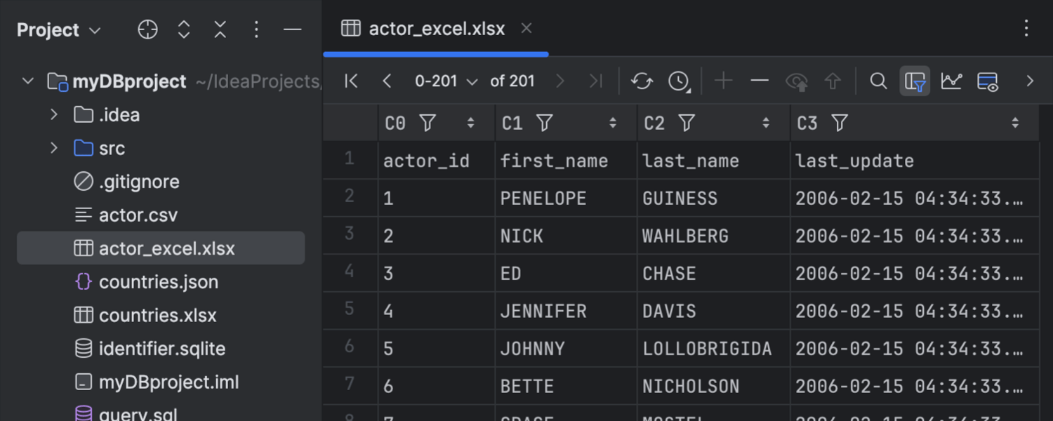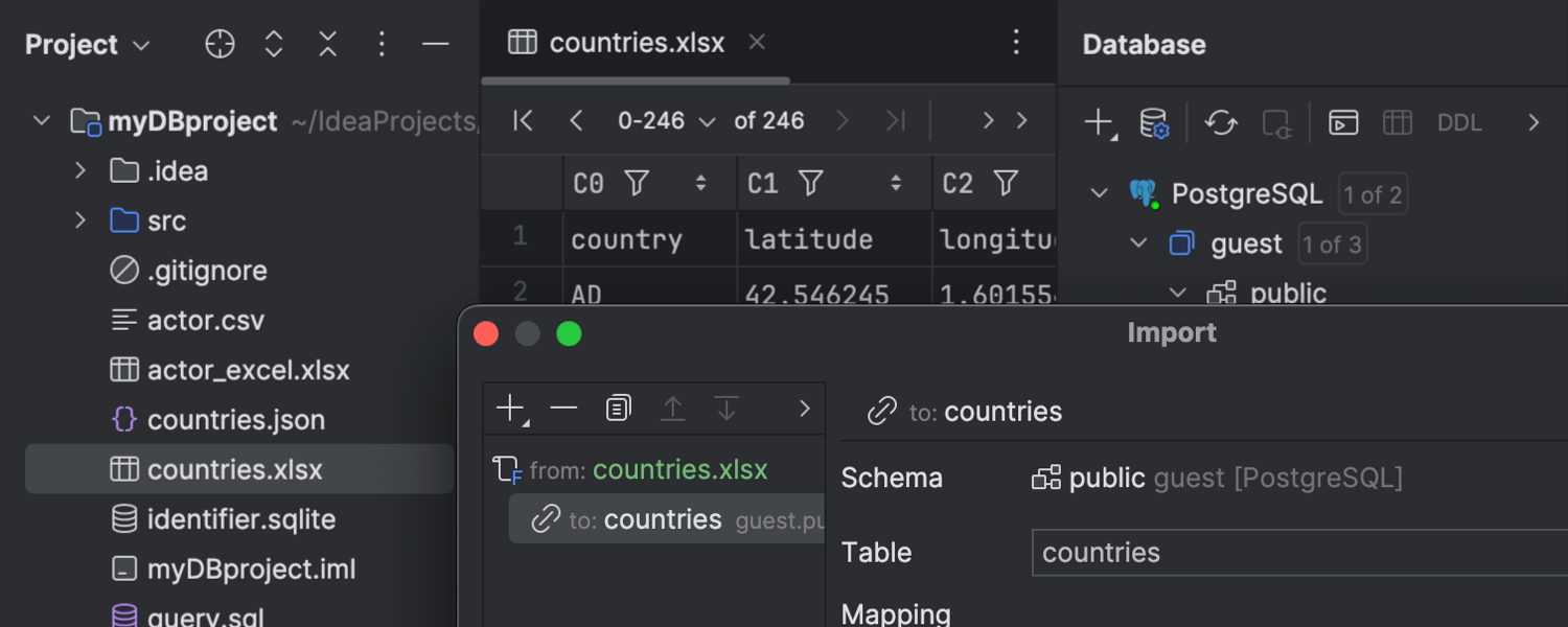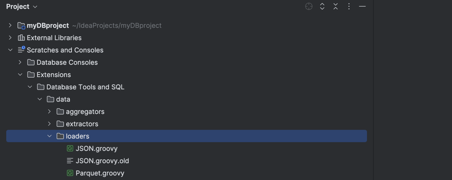 现在,您可以使用可自定义的脚本化加载程序从表格文件导入 Excel、JSON、Parquet 和 shapefile 格式的数据。 将文件从 Project(项目)工具窗口拖动到数据库资源管理器中的架构,然后在 Import(导入)对话框中配置设置。 此外,您只需点击 Project(项目)工具窗口即可在数据编辑器中查看这些文件。 要禁用此行为,请转到 Settings/Preferences | Advanced Settings | Open file as table if detected by scripted loader(设置/偏好设置 | 高级设置 | 如果脚本化加载程序检测到文件,则将其作为表打开)。 您还可以将加载程序放置在 Scratches and Consoles | Extensions | Database Tools and SQL | data | loaders(临时文件和控制台 | 扩展程序 | 数据库工具和 SQL | 数据 | 加载程序)中,以创建自定义加载程序。