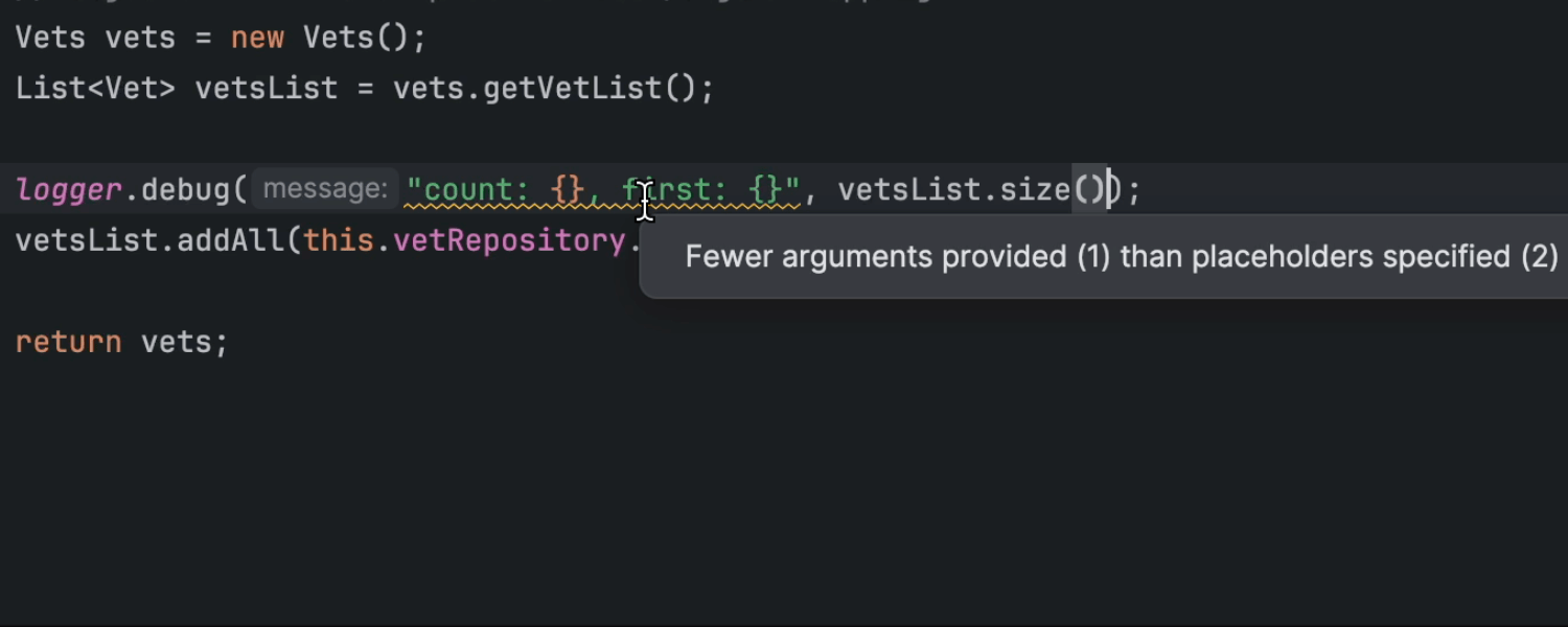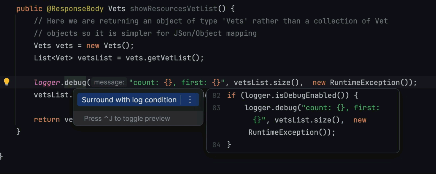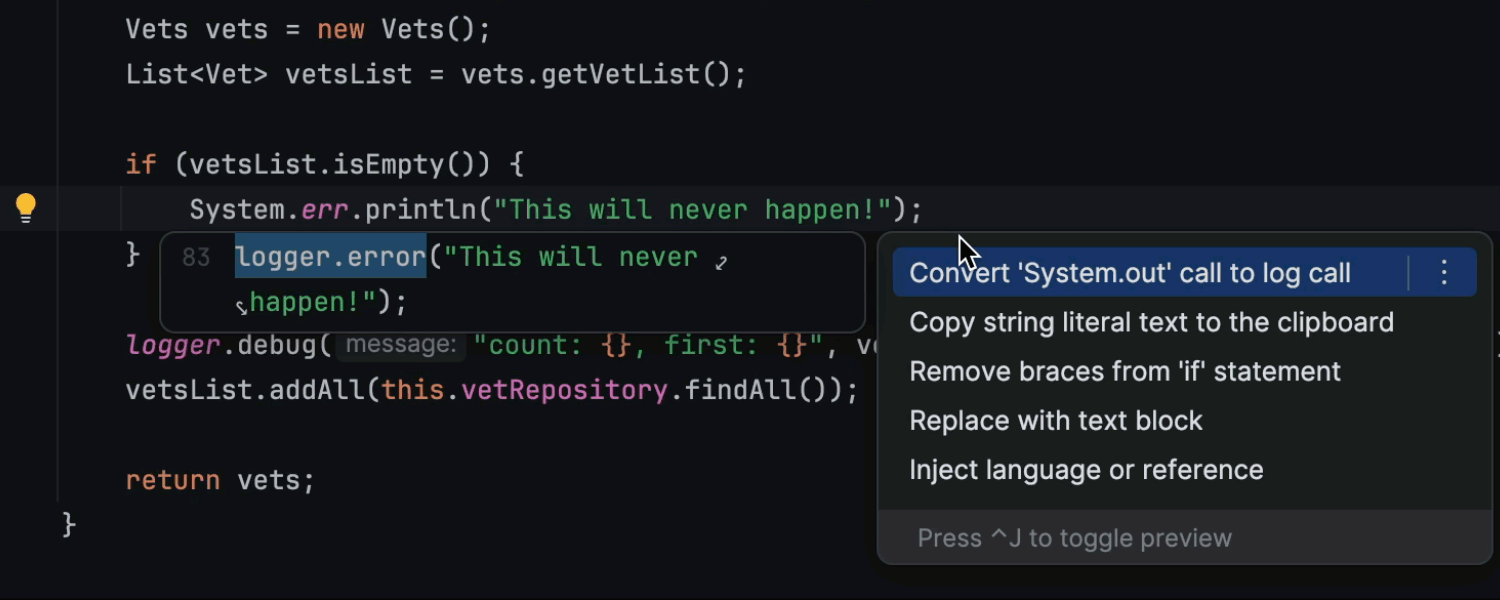 IntelliJ IDEA 2024.2 为 Java 和 Kotlin 引入了增强的日志管理。 新功能包括字符串字面量和实参解析的高亮显示,让您可以从占位符无缝导航到对应实参。 更新后的检查现在可以更好地处理不匹配的记录器形参数量,建议将 System.out.println 语句转换为记录器调用,并提供快速修复为记录器调用添加保护。 了解详情。