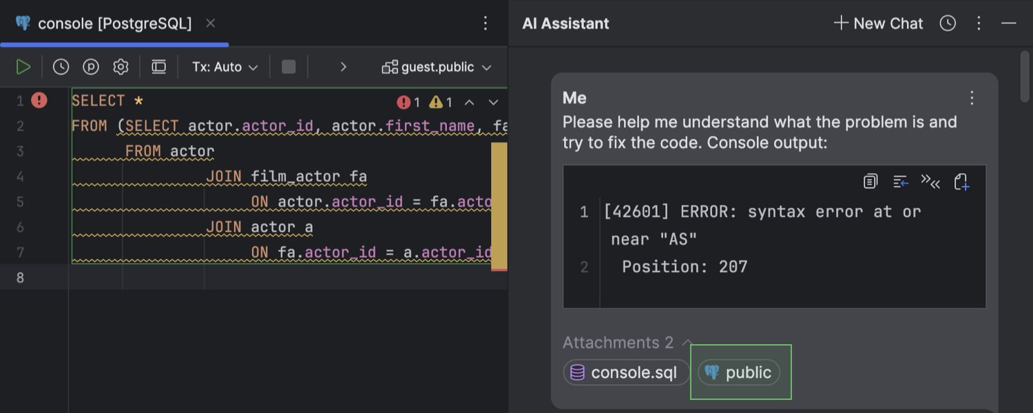 当解释使用所有相关上下文时,它们会更有效。 现在,当您要求 AI Assistant 解释某个查询时,相应的架构会自动附加到聊天中。