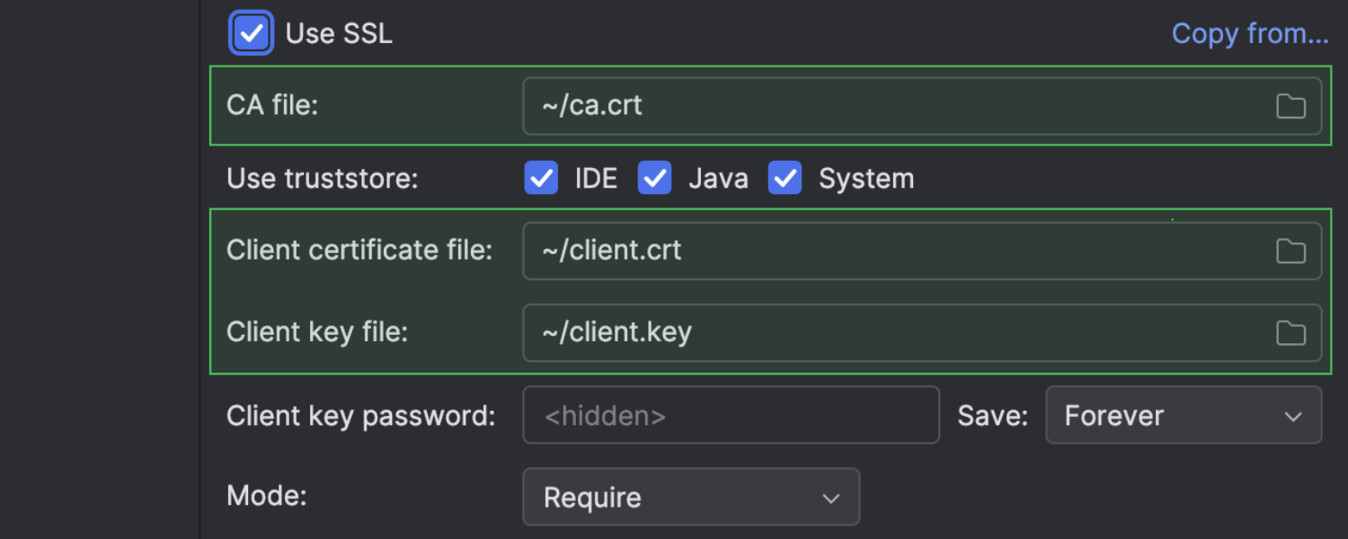 我们已在路径字段中针对 SSL 证书和 BigQuery 密钥文件实现对波浪号 (~) 的支持。 现在,您可以使用该字符在 Data Sources and Drivers(数据源和驱动程序)对话框中指定目录。 要为您的 SSL 连接执行此操作,请按 Ctrl+I 打开对话框,然后选择您要更改设置的数据源。 然后,打开 SSH/SSL 标签页并导航到 SSL 部分。