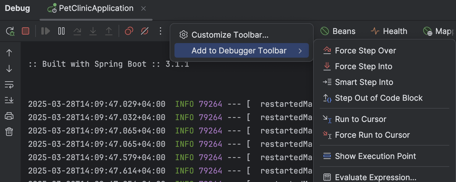 现在,您可以自定义调试器的工具栏以更好地搭配您的工作流,充分利用其强大功能。 在顶部窗格三点菜单的旁边点击右键,选择 Add to Debugger Toolbar(添加到调试器工具栏),以查看可用操作列表。
