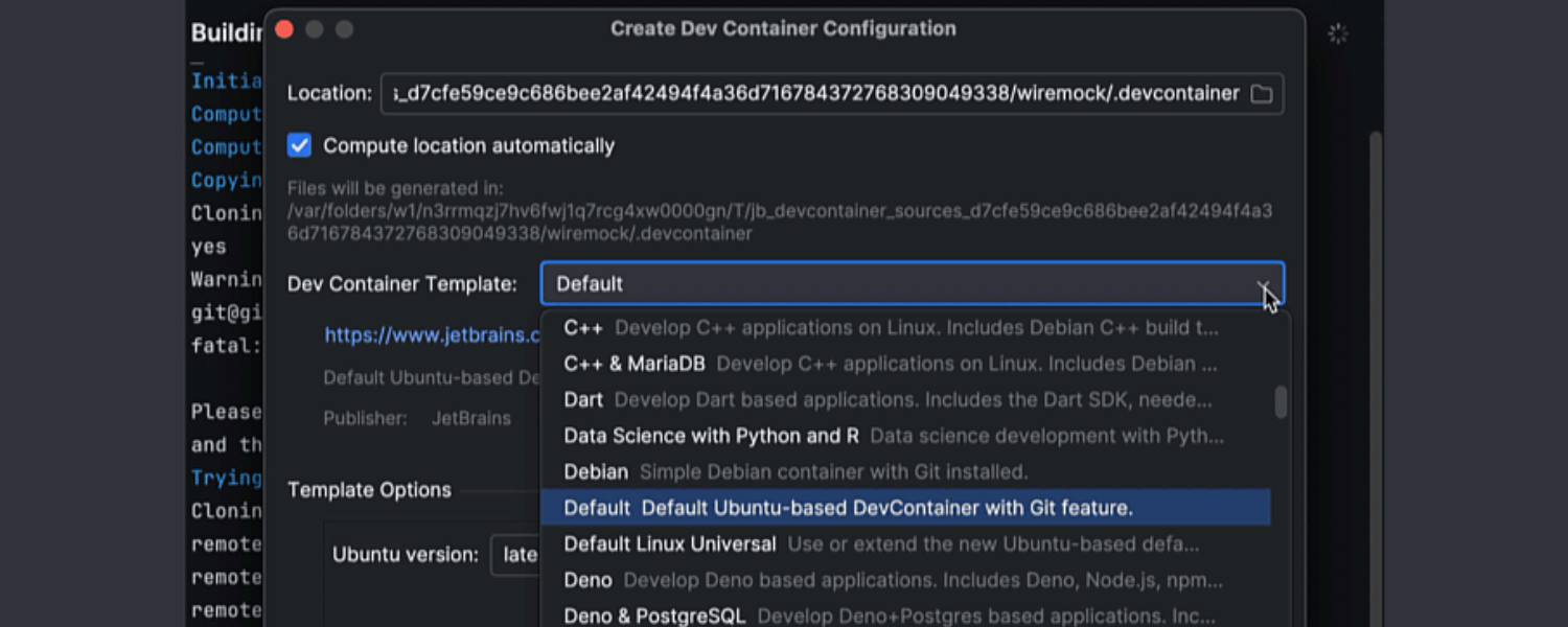 克隆没有 Dev Container 配置的仓库时,IDE 的 New Project(新建项目)向导现在提供了一个新选项,使用已预安装 Git 的基于 Ubuntu 的优化容器。 此更新消除了 Git 缺失等常见问题,减少了设置时间,让您可以专注于编写代码。