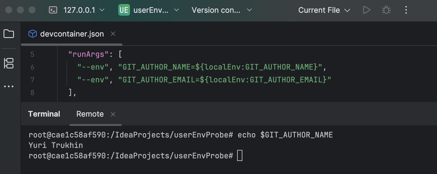 userEnvProbe 的支持 Ultimate IDE 现在支持 devcontainer.json 中的 userEnvProbe 选项,使本地 shell 环境可以更轻松地在 Dev Container 中复制。 这项功能在容器启动期间会自动导入别名、环境变量和身份验证令牌等设置,确保无缝开发体验,且不会在每个子进程上产生性能开销。 保留熟悉的配置有助于团队快速上手并在容器化环境中高效工作。