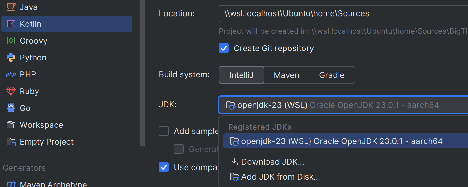 如果您的项目位于 WSL 中,IntelliJ IDEA 2025.1 会自动使用其中可用的 JDK。 这使得在 Windows 中使用 WSL 时的文件索引速度提高 30%,并且不会出现明显延迟或冻结。 符号链接也得到完全支持,并且我们正在继续改进对 Maven、Gradle、Git 和其他工具的支持,确保它们在这些混合设置中无缝运行。