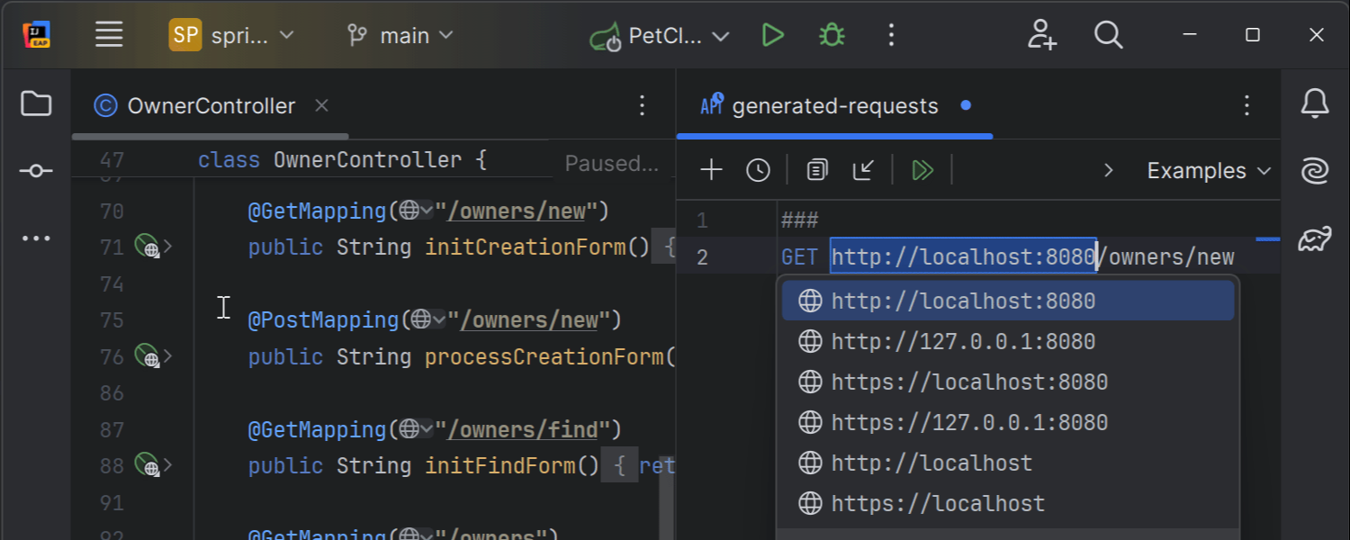 HTTP 客户端现在可以直接在右侧编辑器拆分中打开由代码生成的 HTTP 请求,因此您不再需要在单独标签页中检查这些请求。